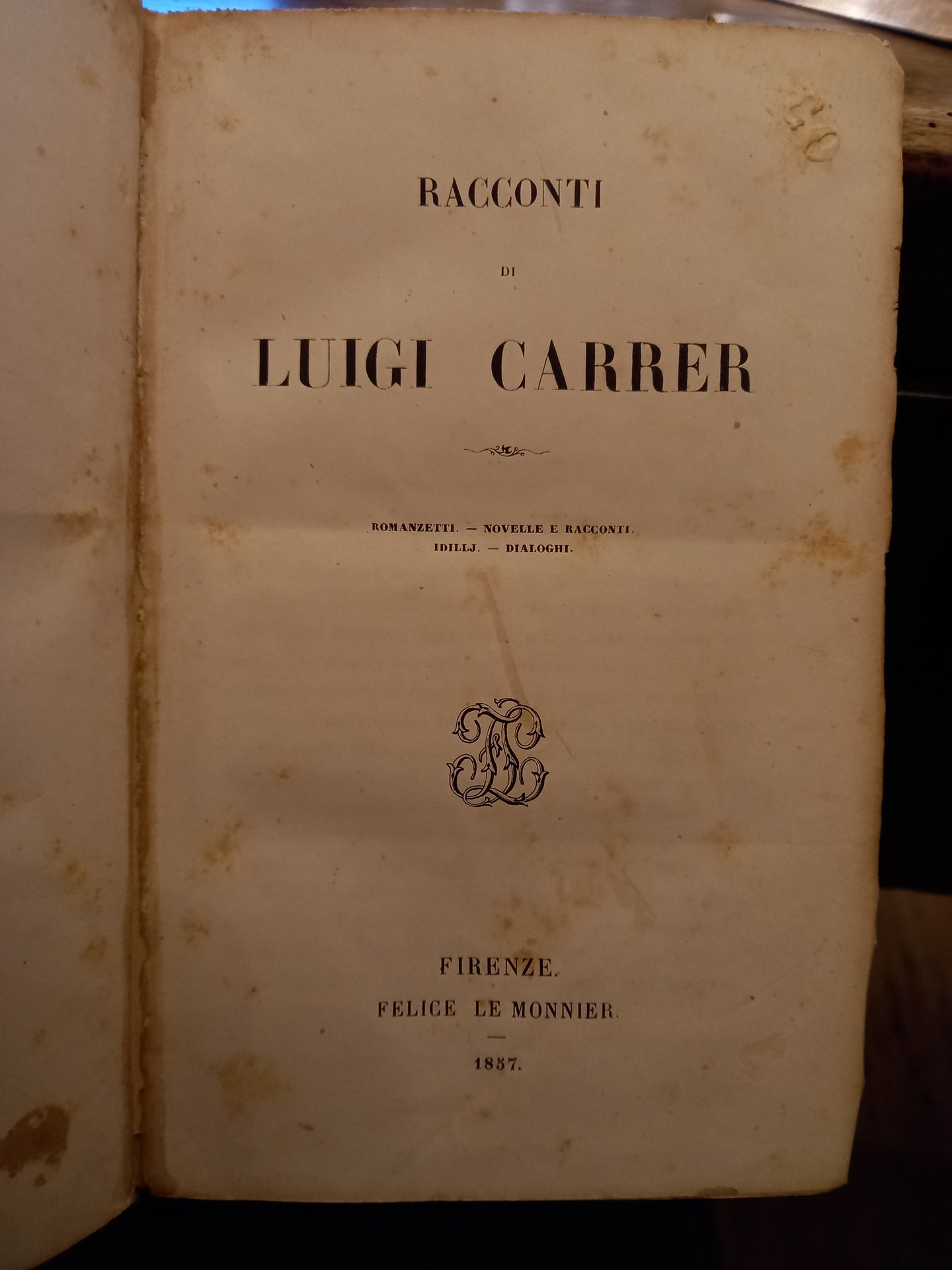 In-8 (18 cm) 647 (1). Piena pelle, piatti cartonati rivestiti di carta marmorizzata.Fa parte (vol. 4) dell'opera: Opere scelte di Luigi CarrerContiene anche: Romanzetti, Novelle, Idilli e dialoghi.Carrer Luigi (1801-1850): poeta, librettista, traduttore, scrittore, professore di filosofia, critico letterario. Nato e morto a Venezia.In-8 (18cm) 647 (1). Full leather, hardboard plates covered with marbled paper. It is part (vol. 4) of the work: Selected Works by Luigi Carrer It also contains: Romanzetti, Novelle, Idilli and dialogues. Carrer Luigi (1801-1850): poet, librettist, translator, writer, professor of philosophy, literary critic. Born and died in Venice.