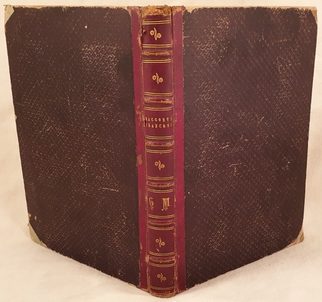 Interessante raccolta di alcuni racconti francesi, supplementi de "La mode illustrée" del 1899. All'interno i seguenti racconti: Les fromentier di Cornely, Rancune di Cornely, Monsieur le Maitre du Chatelmont di Fulbert Dumonteil, Meprise di Fulbert Dumonteil. Numerose incisioni in bianco e nero di Saint, Meurein, Martin, Ariste Boulineaud. In buone condizioni. Copertina in mezza pelle con titolo e decorazioni in oro al dorso in buone condizioni generali con lievi usure ai margini e dorso. Legatura in buone condizioni ma le prime 8 pagine staccate. All'interno le pagine si presentano in buone condizioni con rare fioriture e qualche strappo. Paret mancante a pag. 15. In 4. Dim. 29x21 cm. Pp. 424. Interesting collection of some french tales, supplements of "La mode illustrée" of 1899. Inside the followiong tales: Les fromentier by Cornely, Rancune by Cornely, Monsieur le Maitre du Chatelmont by Fulbert Dumonteil, Meprise by Fulbert Dumonteil. Different black and white engravings by Saint, Meurein, Martin, Ariste Boulineaud In good conditions. Half leather cover with golden title and decorations in the spine general conditions slightly worn in the edges and spine. Binding in good conditions but the first 8 pages detached. Inside pages are in good conditions with occasional foxings and some tears.Missing part in page 15. In 4. Dim. 29x21 cm. Pp. 424.