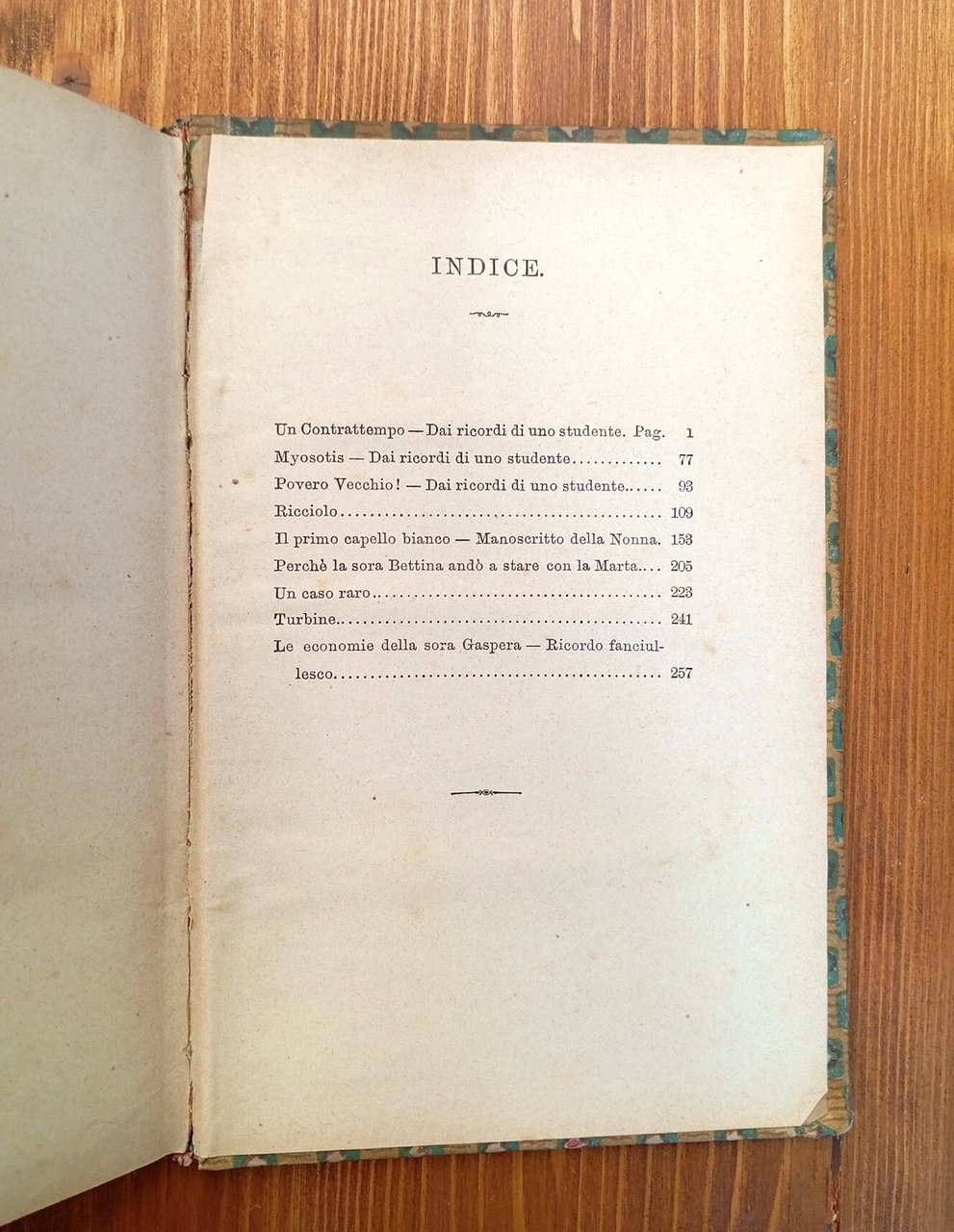 Terza edizione. Collana "Biblioteca delle giovanette" - Volume rilegato in tela editoriale rossa, rivestimento in carta decorata incollato alla copertina da precedente possessore, 269 pagine con incisioni in nero di Enrico Mazzanti intercalate. Include: Un contrattempo - Myosotis - Povero vecchio! - Ricciolo - Il primo capello bianco - Perché la sora Bettina andò a stare con la Marta - Un caso raro - Turbine - Le economie della sora Gaspera. Inevitabili ma tutto sommato ordinari i segni d'uso e del tempo; buon esemplare di un volume di difficile reperibilità -- Classico esempio di racconti morali per l'educazione delle bambine nell'ultimo quarto dell'Ottocento. Rosalia Piatti (Firenze, 1824-1906) fu figlia del rinomato editore Guglielmo Piatti: delle oltre quattrocento opere da lui stampate la più importante è senza dubbio la prima edizione dei "Canti" di Giacomo Leopardi, che lo consacrò definitivamente come grande poeta lirico. Rosalia crebbe in un ambiente assai stimolante e venne indirizzata, cosa assai rara per l'epoca, allo studio delle belle lettere, della musica, del disegno, delle lingue straniere e delle scienze. Ebbe contatti stimolanti con personalità dell'epoca, spesso ospitate nella casa paterna. Nel 1870 pubblicò il suo primo volume, "Racconti di una donna", a cui seguirono "Nuovi racconti di una donna" del 1876, "Novelle e studi dal vero" del 1884 e "Racconti per le giovanette" del 1882. Pubblicò anche "Ricordi su Giulio Piatti pittore" del 1873 e "Monografia" di Maria Alinda Brunamonti nata Bombacci.