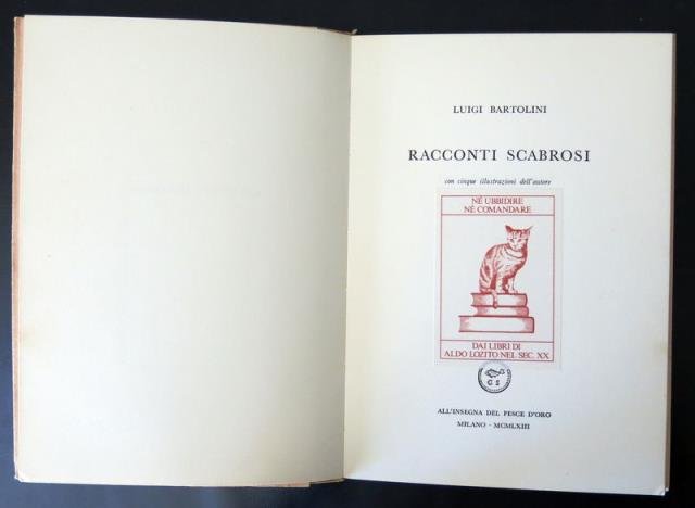 All'Insegna del Pesce D'Oro, Milano, 1963. Con cinque illustrazioni dell'Autore. Volumetto a cura di Vanni Scheiwiller impresso in mille copie numerate da I a 1000. Copia n. 916. In 12esimo, pp. 101 (con Indice delle Illustrazioni). bross. edit. in carta martellata rosa con risguardi. Simpatico ex libris di appartenenza al frontespizio (gatto su tre tomi). Una minima e normale patina di copertina, interno molto buono. .