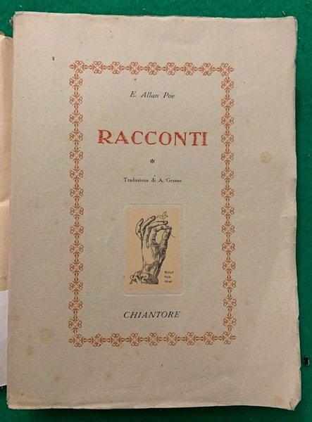 In 4°; 401, (7) pp. Brossura editoriale illustrata con titolo impresso in rosso e nero. Sopraccoperta illustrata, qualche difetto, forellino e segno del tempo, rinforzo al recto della sopraccoperta e per il resto in ottime condizioni di conservazione. Non comune a reperirsi con la sua sopraccoperta editoriale. Fra i racconti: Ligeia, Eleonora, Metzengerstein, Manoscritto Trovato in una Bottiglia, Una Discesa nel Maelstrom, Lo Scarabeo d'Oro, L'Assassinio della Rue Morgue, Il Mistero di Marie Roget, La Lettera Rubata.