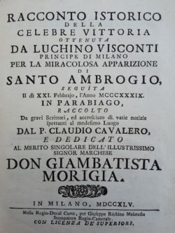 Racconto istorico della celebre vittoria ottenuta da Luchino Visconti principe di Milano per la miracolosa apparizione di Santo Ambrogio seguita il dì XXI Febbraio l'anno MCCCXXXIX in Parabiago [.].