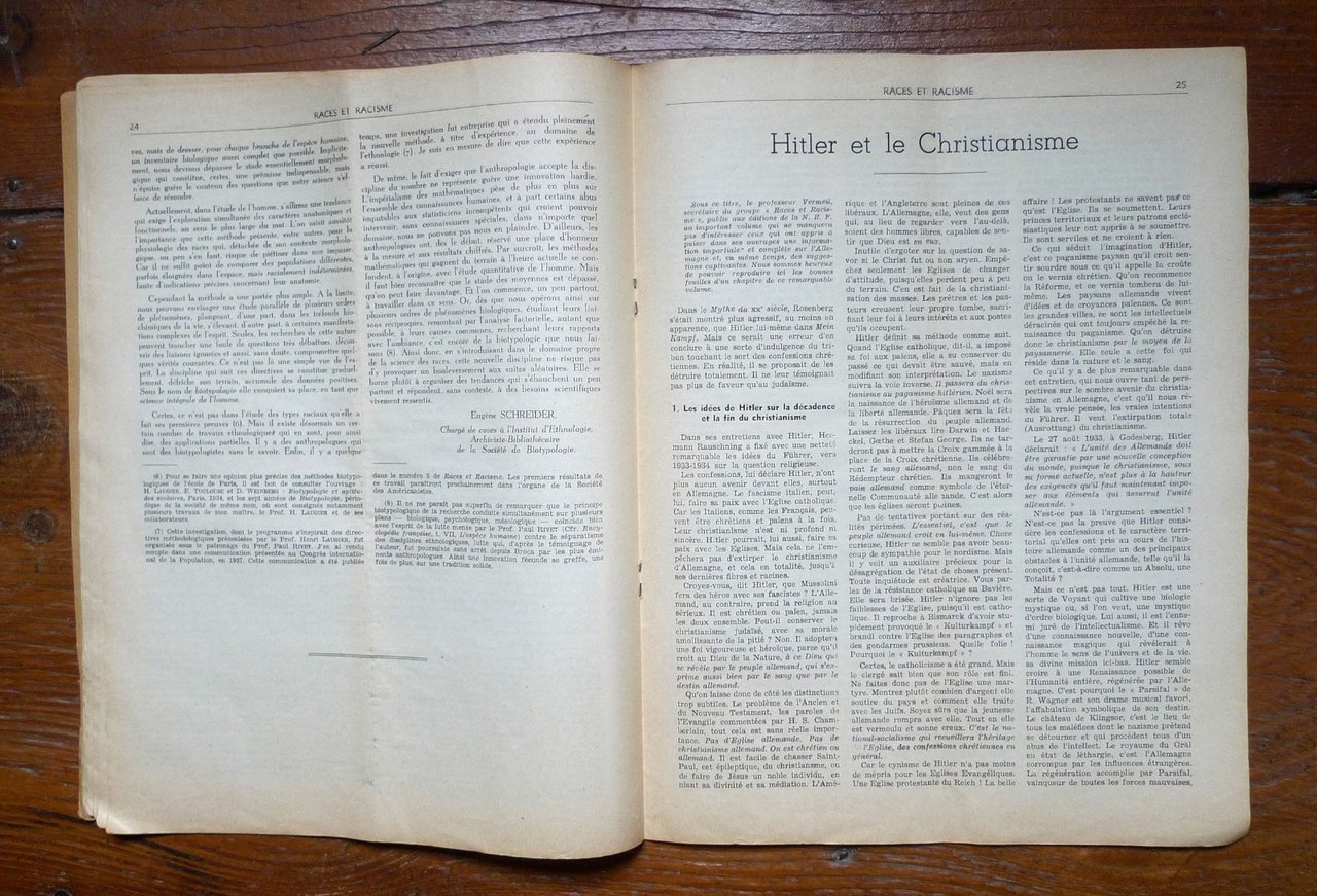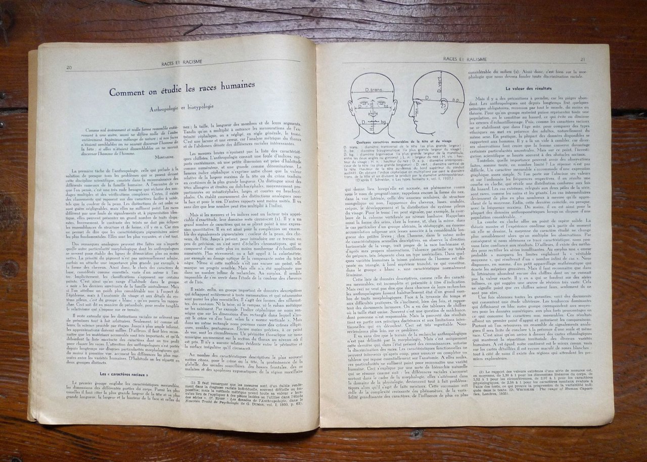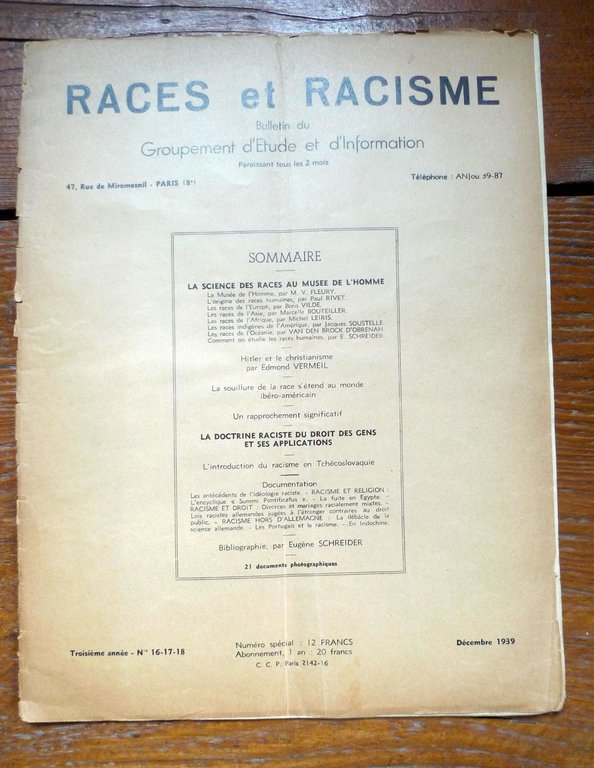 RACES ET RACISME. Troisième année n.16-17-18 Décembre 1939.BULLETIN DU GROUPEMENT D'ETUDE ET D'INFORMATION.Administrateur-gerant: Maurice Vanikoff.Paris 1939,brossura, rilegatura con punto metallico,32x24,5 cm., pp.48,illustrazioni in bianco e nero,testo in francese,peso: g.400cod.10089CONDIZIONI DELLA RIVISTA: accettabili,il piatto anteriore della copertinaè quasi completamente staccato,manca l'ultima di copertina,piega centrale,pagine ingiallite
