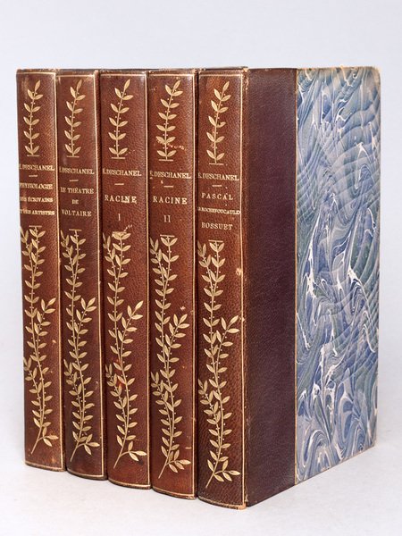 5 vol. in-12 reliure de l'époque demi-chagrin brun, dos lisse orné en long (motif floral), Calmann Lévy, Ancienne Maison Michel Lévy Frères, Paris, 1891, 1885, 1886, et Physiologie : Librairie de L. Hachette et Cie, 1864 Intéressant ensemble de 5 volumes en élégante reliure uniforme, d'oeuvres de critique littéraire d'Emile Deschanel (les 3 premiers titres sur les 4 appartiennent à la série "Le romantisme des classiques"). Père du futur président de la République Paul Deschanel, Emile Deschanel fut tout à la fois un homme politique, exilé par Napoléon III, et écrivain et critique littéraire, professeur au Collège de France, titulaire de la chaire de « Langue et littératures françaises modernes ».