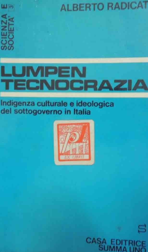 Alberto Radicati, Lumpen tecnocrazia. Indigenza culturale e ideologica del sottogoverno in Italia, Casa Editrice Summa Uno, s.l. (ma stampato a Farigliano, Cuneo, presso Milanostampa) 1972, cm 20, br. ed. Collana Scienza e società, n. 3. Piccolo ex libris applicato alla prima di copertina. Leggere tracce d’uso, minima brunitura della carta, per il resto ben conservato.