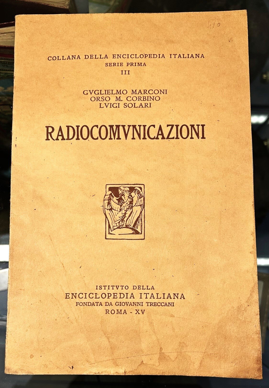 >in-4 (mm 238x155), pp. 104, brossura editoriale. Interessante monografia arricchita da illustrazioni n.t. Estratto dal volumeXXVIII della Enciclopedia italiana. "Si intendono per radiocomunicazioni le comunicazioni rapide a distanza senza un collegamento artificiale, basate sulle proprietà delle onde elettriche..." Edizione originale. Buon esemplare nonostante una leggera macchia d'umido nell'angolo inferiore destro.