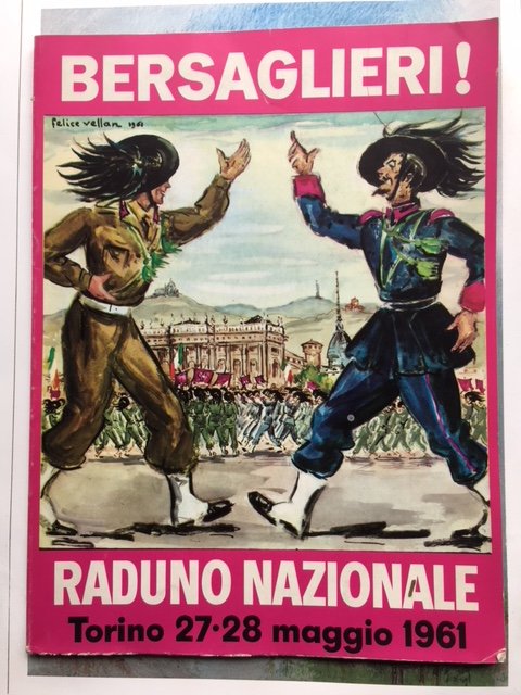 >in-4, (mm 320x240), pp. 82, broch. editoriale figurata illustrata da Felice Vellan. Monografia realizzata in occasione del 17^ raduno Nazionale dei Bersaglieri. L'adunata nazionale dei bersaglieri, o raduno nazionale dei bersaglieri, è una manifestazione a cadenza annuale che si svolge generalmente durante il mese di maggio in una città d'Italia scelta di volta in volta dal consiglio direttivo dell'Associazione nazionale bersaglieri. Il primo raduno nazionale si è svolto a Trieste nel 1923.