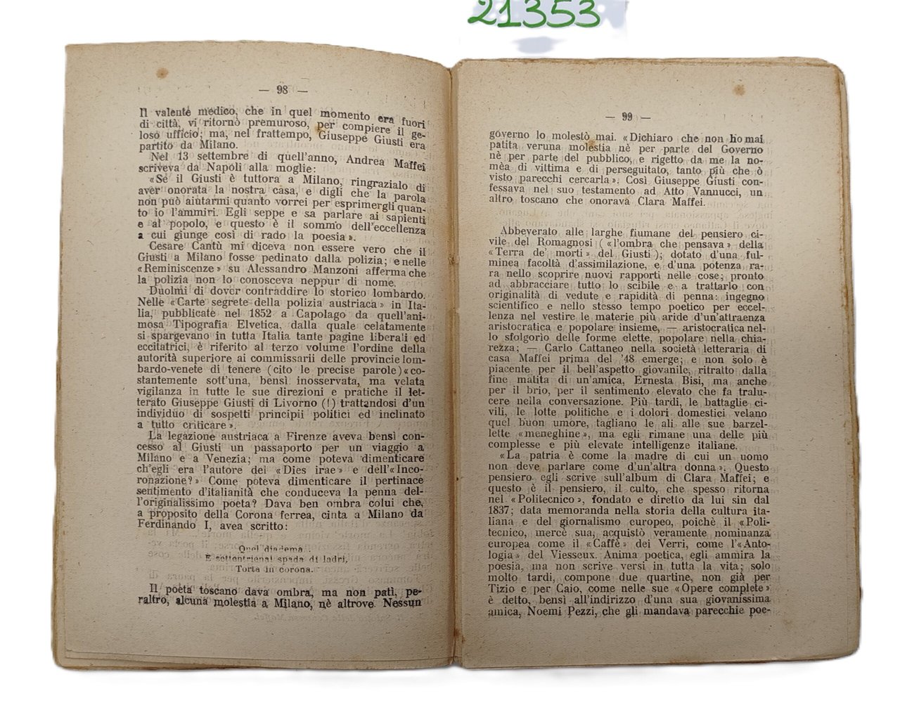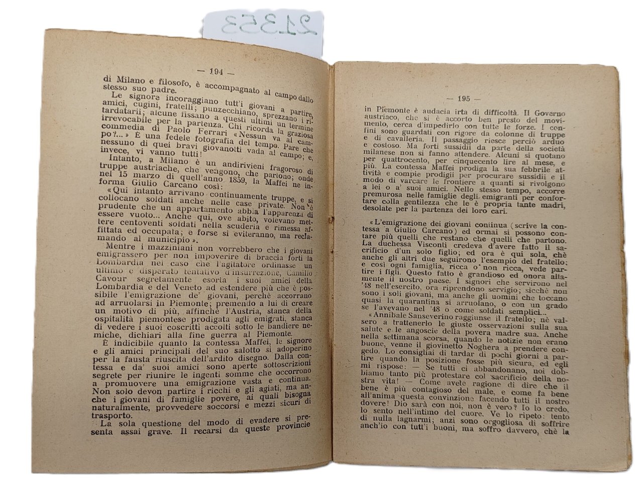 In precarie condizioni, legatura morbida editoriale brunita con fioriture diffuse ai piatti al dorso, dorso con piccole mancanze ai margini, pieghe di lettura ed uno strappo di centimetri 2 al margine superiore tra dorso e quarta di copertina, tagli irregolari bruniti con fioriture, firma di possesso all'antiporta e al frontespizio, fioriture alle pagine interne che non vanno a disturbare la lettura, legatura allentata, numero pagine 303, una mancanza al margine superiore di pagina 303 senza interessamento del testo dimensioni cm 19,4 * 13,5