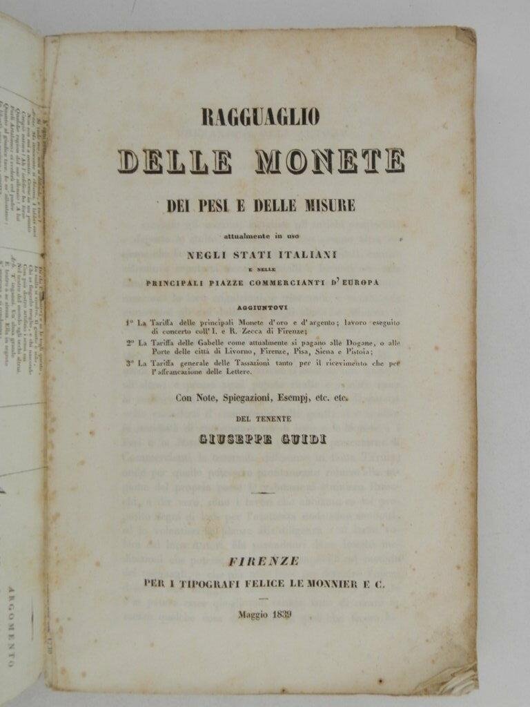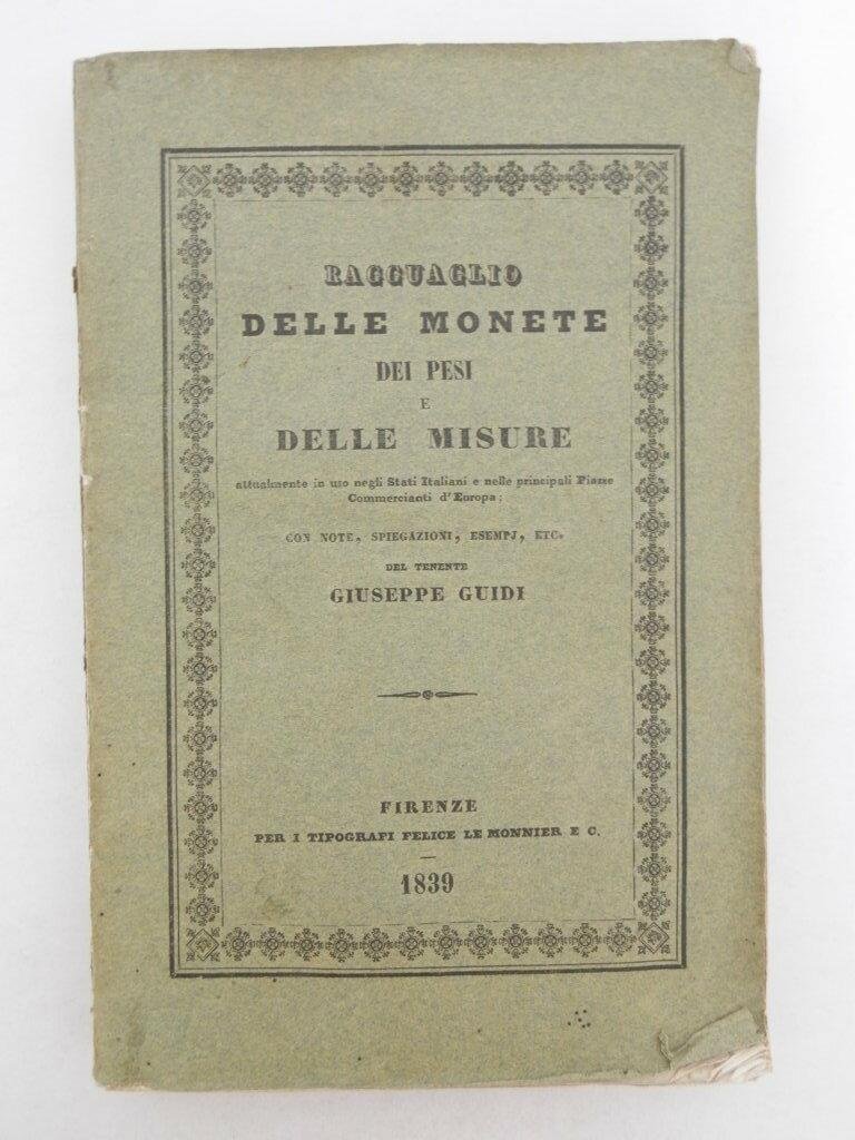 Ragguaglio delle monete dei pesi e delle misure attualmente in uso negli Stati Italiani e nelle principali piazze commercianti d'Europa con note, spiegazioni, esempi etc
