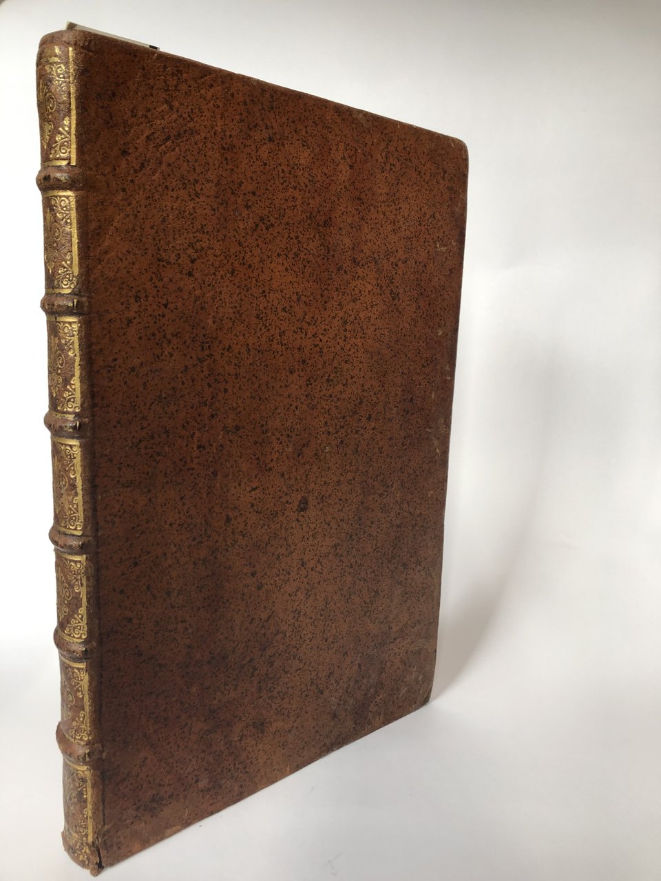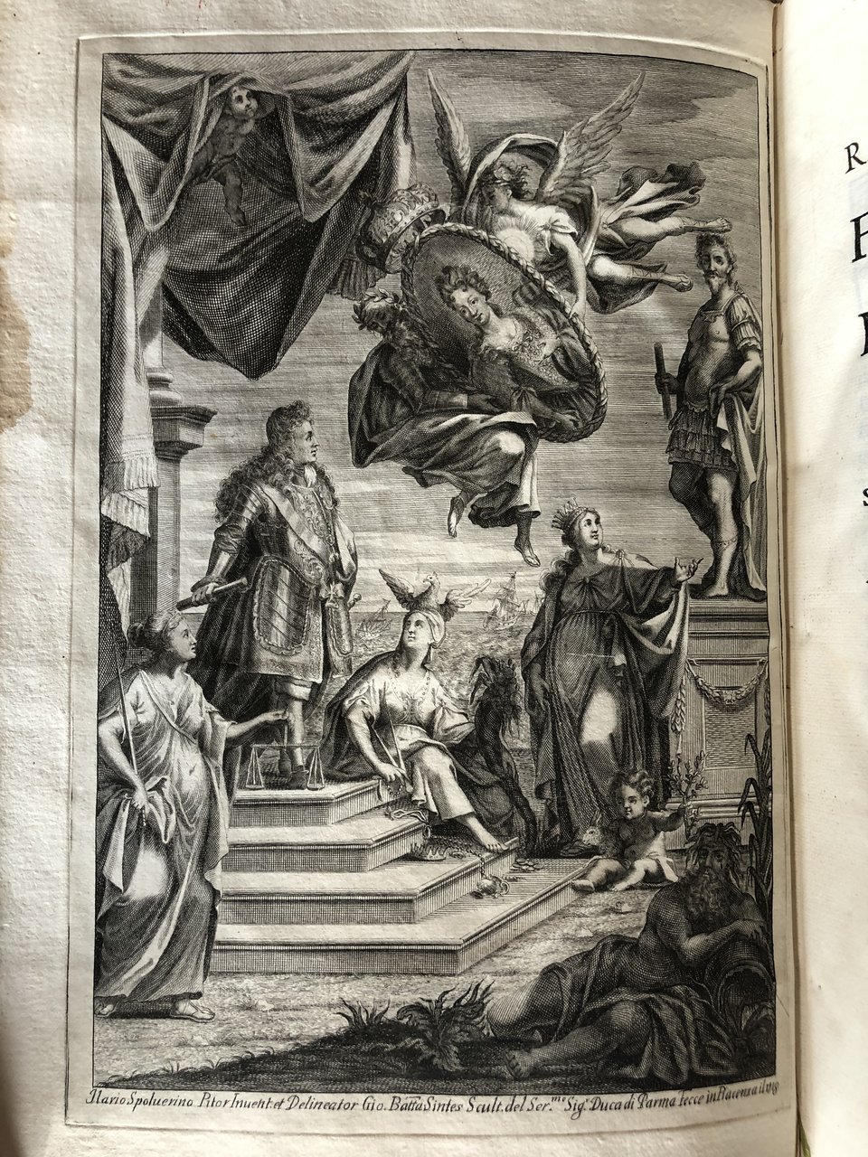 In folio (314x206), pp. 115. Iniziali e finalini in xilografia. Antoporta allegorica e 5 grandi tavole calcografiche ripiegate disegnate da Ilario Spolverino e incise da Giovanni Battista Sintes e Francesco Maria Francia. Piccolo strappo al margine interno di 3 tavole che lambiscono l’immagine, strappo al margine interno della tavola in prossimità della delegazione vaticana che si estende circa 40 mm, tenue vecchia macchia di umidità all’ultima tavola. Legatura coeva in vitello, dorso a nervi e scomparti decorati col giglio Farnese in oro, tagli a spruzzo rossi.