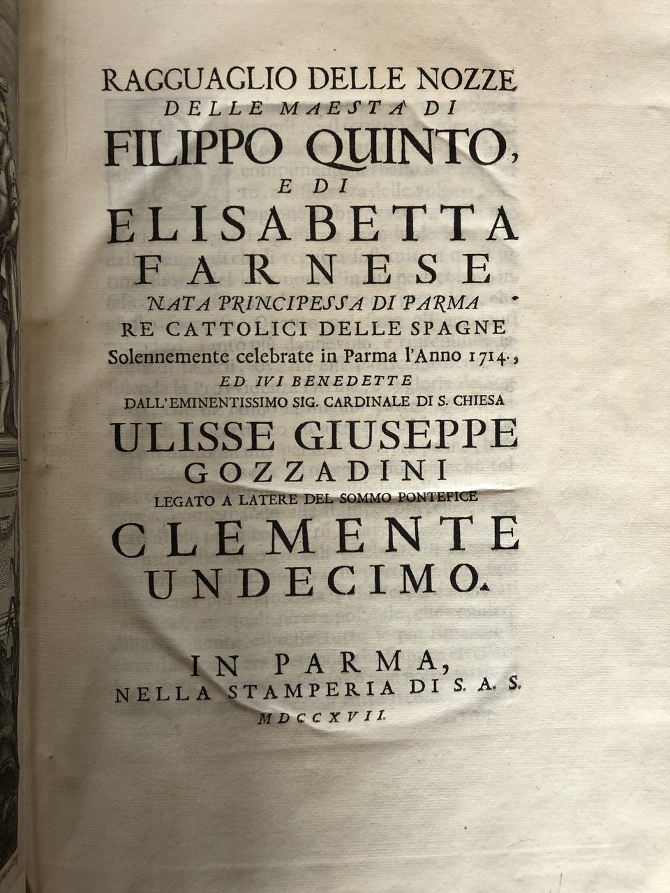 RAGGUAGLIO DELLE NOZZE DELLE MAESTA’ DI FILIPPO V, E DI ELISABETTA FARNESE, NATA PRINCIPESSA DI PARMA RE CATTOLICI DELLE SPAGNE, SOLENNEMENTE CELEBRATE IN PARMA L’ANNO 1714.