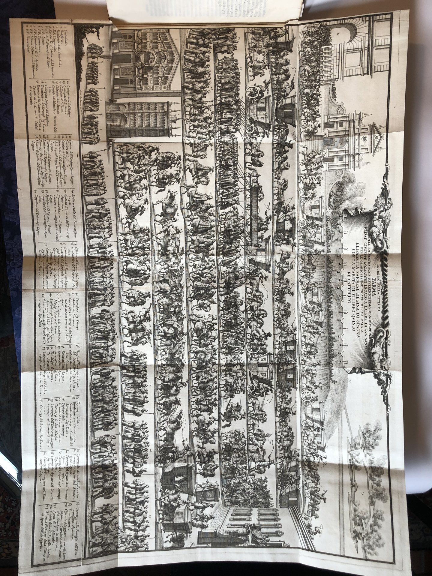 - Prima edizione del celebre livre de fêtes che celebra le nozze, di Filippo V Re di Spagna (1683-1746), con la sua seconda moglie Elisabetta (1692-1766), ultima discendente dei Farnese che regnavano su Parma e Piacenza, dal XVI secolo. La più grande delle incisioni [892 x 617 mm], mostra l'ingresso a Parma della delegazione vaticana del, cardinale Gozzadini, vescovo di Imola. Le altre quattro tavole raffigurano l'esterno, decorato della cattedrale di Parma. l'interno sontuosamente, decorato con drappi e emblemi allegorici. la cerimonia di nozze, e un piano architettonico della cattedrale.Provenienza:, Proprietà di istituto accademico californiano, (USA).Bibliografia : Cicognara 1491, Ruggieri 837, Vinet 567.
