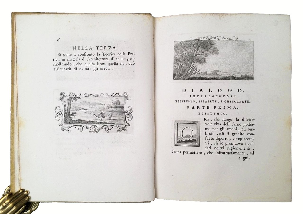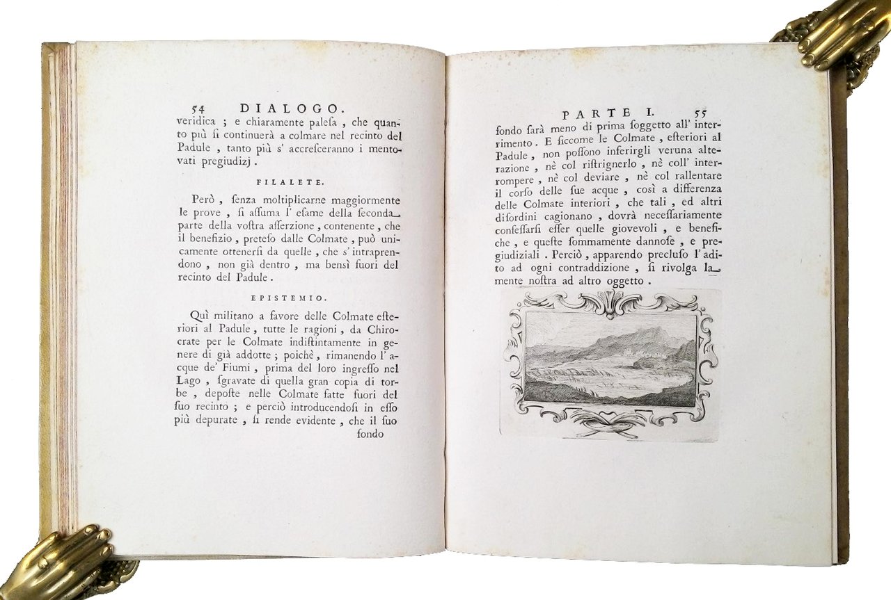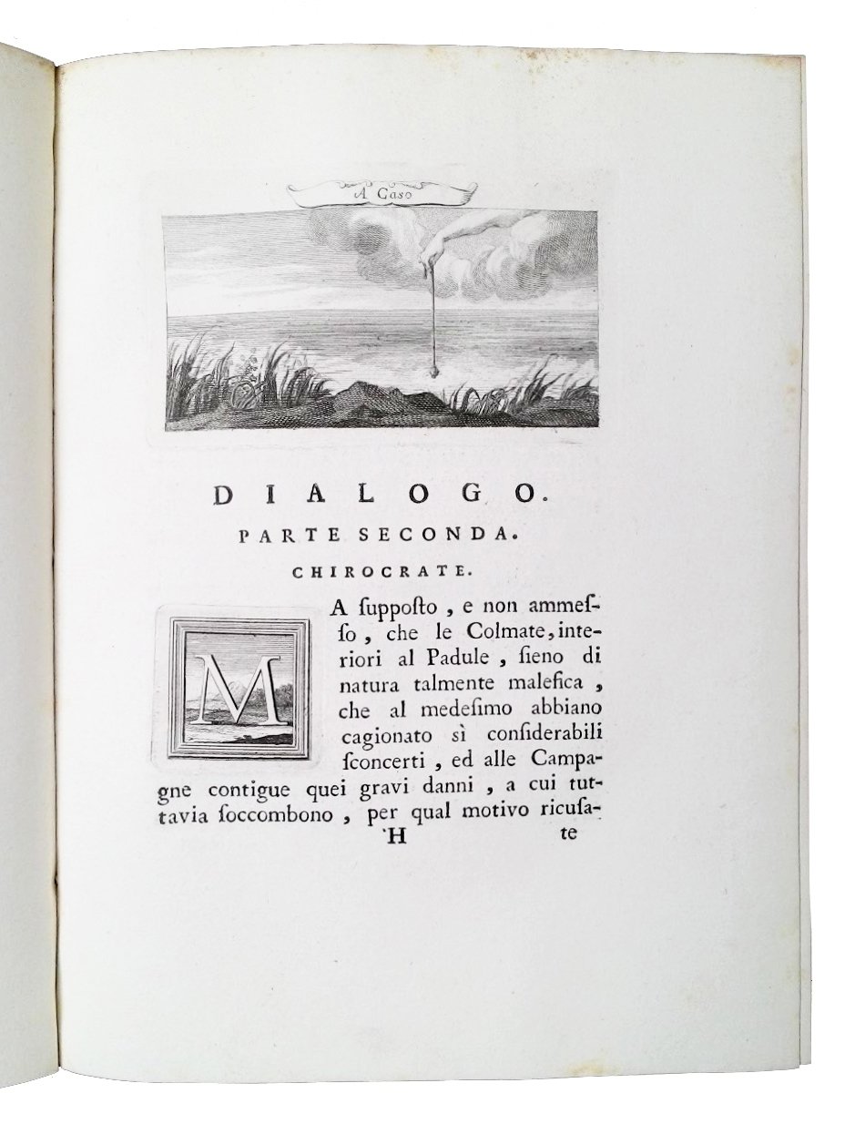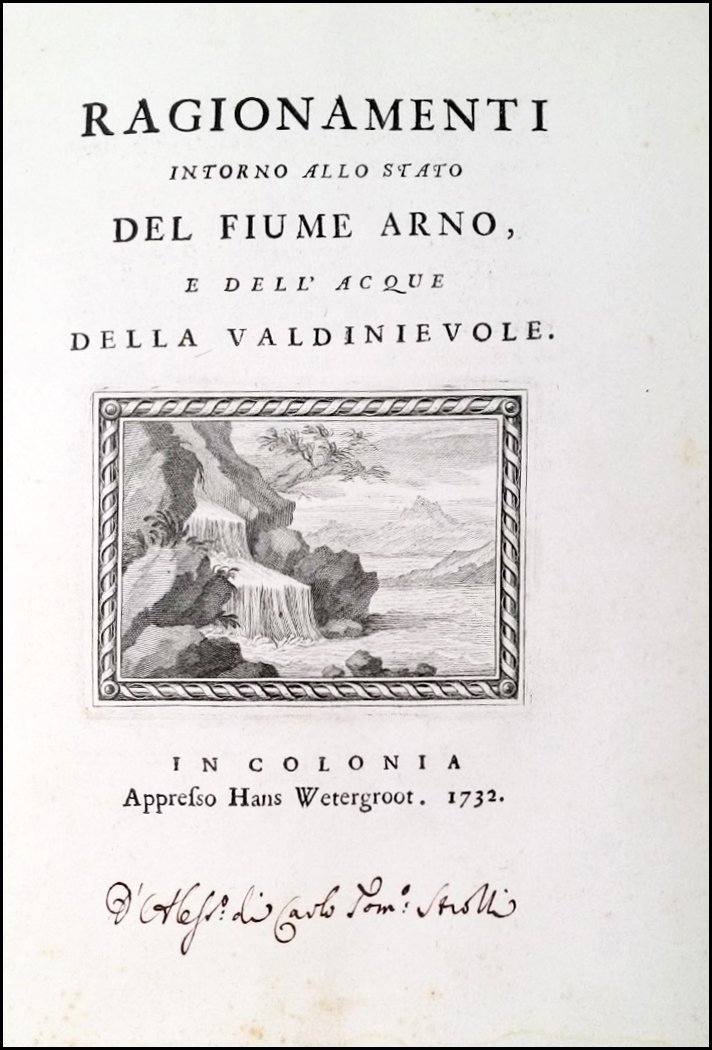in-4° (238x176 mm); leg. coeva in piena pergamena rigida, dorso liscio con titolo a caratteri dorati su tassello, tagli spruzzati di rosso e verde, carte interne "forti" con testo marginoso; pp. 157, (9 b.); front. a caratteri neri con grande vignetta calcografica raffigurante un cordo d'acqua tra le rocce; capilettera con piccoli paesaggi incisi su matrice di rame; pregevoli testatine e finalini finemente incisi su matrice di rame con paesaggi fluviali, imprese, putti e strumenti scientifici. Prima ed., stampata in Toscana (Colonia è una falsa località di edizione), attribuita prevalentemente a Silvio Feroni, ma anche a Edoardo Corsini e la parte finale al P. Guidi (cfr.: M. Parenti, Dizionario dei luoghi di stampa falsi, inventati o supposti; G. Melzi, Dizionario di opere anonime e pseudonime di scrittori italiani); trattasi di un dialogo diviso in tre parti riguardante la navigazione del fiume Arno, il canale della Gusciana, i fossi del Padule di Fucecchio, la "remissione del fiume Pescia nel suo antico alveo", nonché altri elementi della pratica e della teoria dell'"architettura d'acque". Edoardo Corsini, o Odoardo (1702-1765), scolopio, fu professore di logica, metafisica, etica e lettere all'Univ. di Pisa. Fu inoltre studioso di filologia, epigrafia, numismatica e storia. Ricoprì la carica di generale dell'ordine degli Scolopi. Nato a Fellicarolo di Fanano (MO) e morto a Pisa. Silvio Feroni, marchese fiorentino, membro dell'Accademia dell'Arte del Disegno. Prov.: Indicazione d'appartenenza a "La Vecchia Parma - Antiquariato" su etichetta incollata al contropiatto anteriore e manoscritta a china in fondo al front. (illeggibile). Rif.: IT\ICCU\SBLE\006047. OCLC, 35166555. Cond.: Leggere tracce d'uso. Opera quasi in perfette condizioni generali. -- FIRST EDITION OF A WORK ON ARNO RIVER, PRINTED IN TUSCANY (COLOGNE IS A FALSE PLACE OF ISSUE). Light traces of use. Copy quite in fine condition.