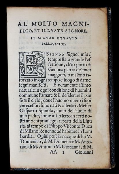 In 8° piccolo; (8), 164, (4) pp. Legatura ottocentesca in mezza tela con piatti foderati con carta scura. Marca tipografica al frontespizio in cornice figurata con un gallo che canta. In basso il mondo. Motto: tota nocte excubo. Leggerissimo e non fastidioso probabilmente dovuto della qualità della stampa. Tagli scuri e nel complesso buon esemplare. Esemplare di celebre provenienza, come da bell'ex-libris applicato all'interno del piatto anteriore, proveniente dalla raccolta personale del grande patriota e bibliofilo originario di Lugo (Ravenna), Giacomo Maria Manzoni che fu membro del Consiglio dei Deputati di Roma nel 1848, rappresentante del popolo nella Costituente romana nel 1849 e Ministro delle Finanze nella Repubblica Romana. Manzoni pubblicò alcune opere basilari nella storiografia italiana come gli Annali tipografici torinesi del sec. XV (1863), Annali tipografici dei Soncino (4 voll., 1883-86, incomp.), Studi di bibliografia analitica (3 voll., 1881-82). Celebre la sua ricchissima collezione di edizioni rare, specie di incunaboli e di testi di lingua, in cui confluì anche la raccolta numismatica e quella di autografi di B. Borghesi. La sua collezione venne poi dispersa in una famosa asta tenutasi nel 1893. Prima non comune edizione di quest'opera di ispirazione protestante-riformista attribuita a vari autori fra i quali Flavio Alessio Ugoni, monaco cassinese, nato a Brescia e autore di un celebre trattato sul sonno e i sogni e di alcune altre opere, all'umanista Girolamo Ugoni che fu anche podestà di Orzinuovi in Provincia di Brescia o al poeta, originario di Salò, ma che visse quasi tutta la sua vita a Brescia, Giovanni Andrea Ugoni. Il fatto che il volume presenti la dedicatoria al nobiluomo ligure Ottavio Pallavicino scritta dall'umanista Francesco Spinola sembra suggerire, come autore dell'opera, Giovanni Andrea Ugoni che di Spinola fu grande amico e con il quale frequentava gli ambienti riformatori bresciani. Si ricorda che Spinola fu condannato all'annegamento come eretico relapso, sembra proprio, dopo che il suo nome era stato fatto dall'Ugoni in uno dei numersi interrogatori ai quali fu sottoposto dall'Inquisizione. Di quest'idea è anche Anne Jacobson Schutte che nel suo By "Force & Fear Taking and Breaking Monastic vows in early modern Europe" pubblicato nel 2011 a pagina 28-29 scrive "The last sixteenth-century work critical of forced monachization to be considered here is a dialogue published in Venice in 1562: Ragionamento del magnifico signor Ugoni gentiluomo bresicano because the author's first name is not given on the title page or anywhere else in the book, confusion persists a sto what it may have been. Compilers of library catalogues, booksellers, and scholars have dubbed him Flavio Alessio or Stefano Maria, but without a doubt he was Giovanni Andrea Ugoni (1507- after 20 Decembre 1571). This philo-Protestant native of Salò, a member of the Brescian patriciate and an accomplished poet, was tried by the Inquisition of Brescia in 1544-45 and again in 1552-1553; both times he was convinte of heresy. In late 1564 he was summoned bfore the Inquisition of Venice, which tried and condemned him in 1565. Given that he was a recidivist, it was probably his status as a Brescian noble that spared him a death sentence. Spinola's dedication describes the dialogue as a faithful tran script o fan after-dinner conversation held in the Brescian palazzo of Virginia Pallavicini Gambara not long after the death in 1549 of Pope Paul III. ". Al dialogo, che non si sa se sia svolto realmente o solamente in modo immaginario prendono parte 7 personaggi: Virginia Pallavicini, Luigi Calini, Marcantonio Piccolomini, Camillo Avoguardi, Francesco Gamabra, Giulio Boiardi signore di Scandiano ed il sig. Girolamo di Correggio. Opera stampata a Venezia da Francesco de' Franceschi da Siena per conto del libraio ed editore Pietro da Fino che fu una delle figure del movimento riformatore veneziano. ICCU: IT\ICCU\BVEE\013441.