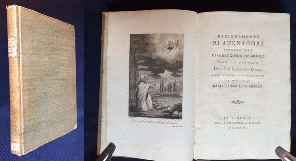 RAGIONAMENTO DI ATENAGORA INTORNO ALLA RISURREZIONE DE' MORTI TRADOTTO DAL GRECO DAL CO. GASPARO GOZZI E PER LA PRIMA VOLTA PUBBLICATO IN MORTE DI MARIA TARMA DE BIZZARRO. IN VINEGIA DALLA STAMPERIA PALESE M.D.CCC.VI.