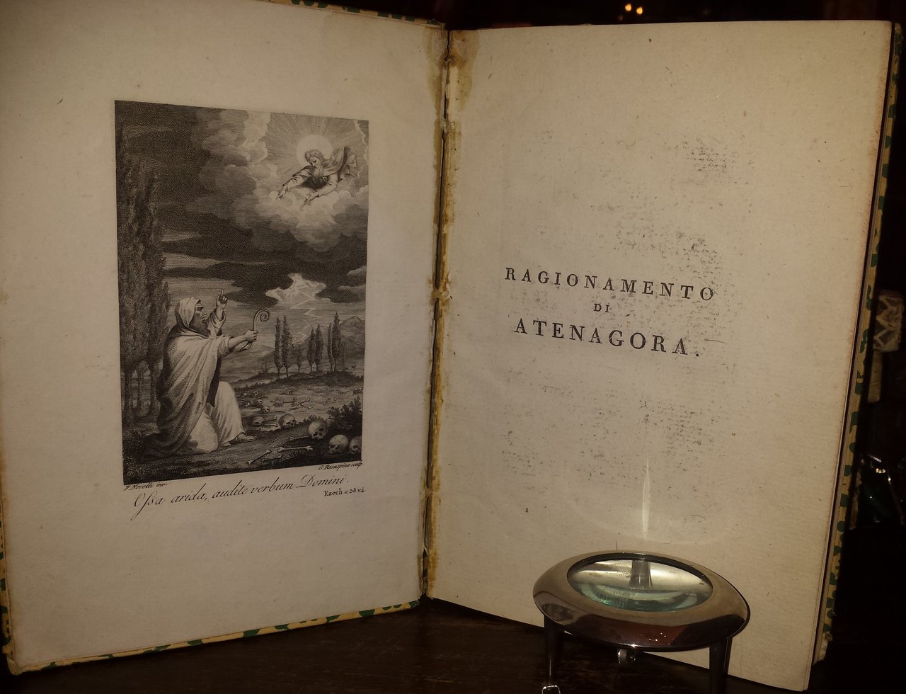In-8 (22 cm) (1) c. (antiporta) XXIII (1) 155 (5). Legatura in cartone rigido coperto da carta decorata. Tagli logori. Tavola all'antiporta "Ossa arida, audite verbum domini" F. Novelli (inv.) e G. Rosaspina (sculp.). Atenagora di Atene (in greco: ?a?a?; Atene, 133 circa – 190 circa) è stato un filosofo, teologo e scrittore greco antico apologista cristiano, vissuto nel II secolo. Attribuito ad Atenagora, con molte riserve,"?e? a?ast?se? ?e?" (La Risurrezione dei Morti) è diviso in due parti, nella prima vengono confutate le obiezioni contro la tesi della resurrezione, nella seconda si dimostra che la resurrezione è possibile. Rifiutando il dogma platonico del corpo come prigione dell'anima, ed affermando la complementarità tra materia e spirito, Atenagora accetta la risurrezione fisica dei morti sulla base dell'onnipotenza di Dio allo scopo di rendere manifesta per l'eternità l'immagine umana.