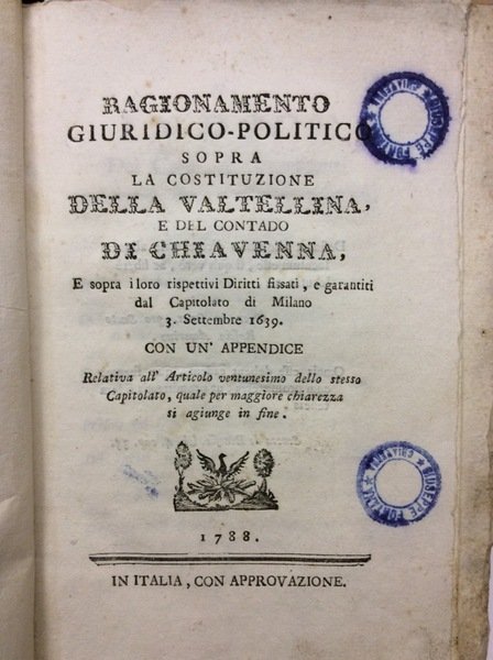 RAGIONAMENTO GIURIDICO-POLITICO SOPRA LA COSTITUZIONE DELLA VALTELLINA, E DEL CONTADO DI CHIAVENNA. - E sopra i loro rispettivi Diritti fissati e garantiti dal Capitolato di Milano, 3 settembre 1639. Con un'Appendice relativa all'articolo ventunesimo dello stesso Capitolato, quale per maggiore chiarezza si aggiunge in fine.