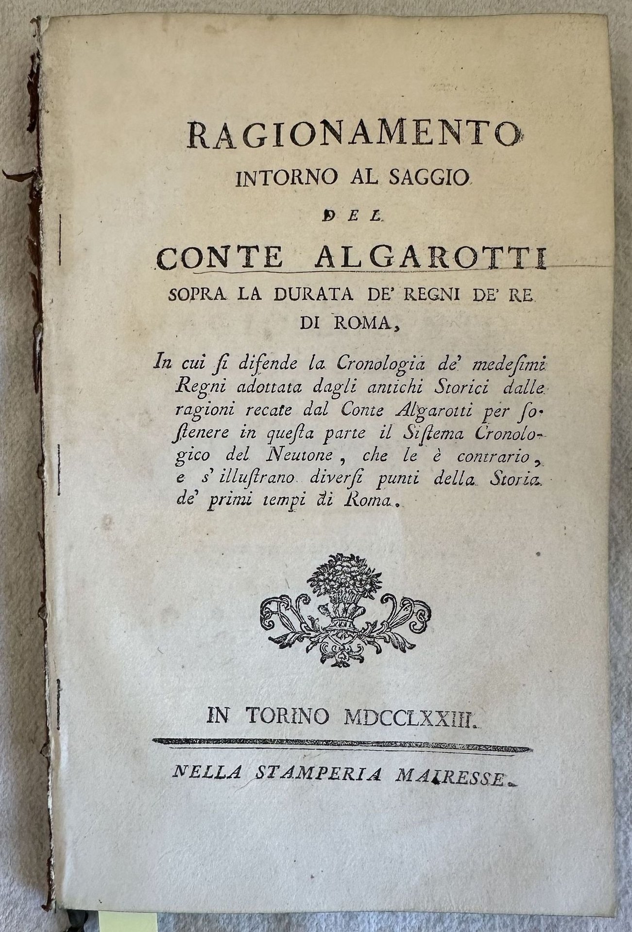 RAGIONAMENTO INTORNO AL SAGGIO DEL CONTE ALGAROTTI SOPRA LA DURATA DE REGNI DE RE DI ROMA