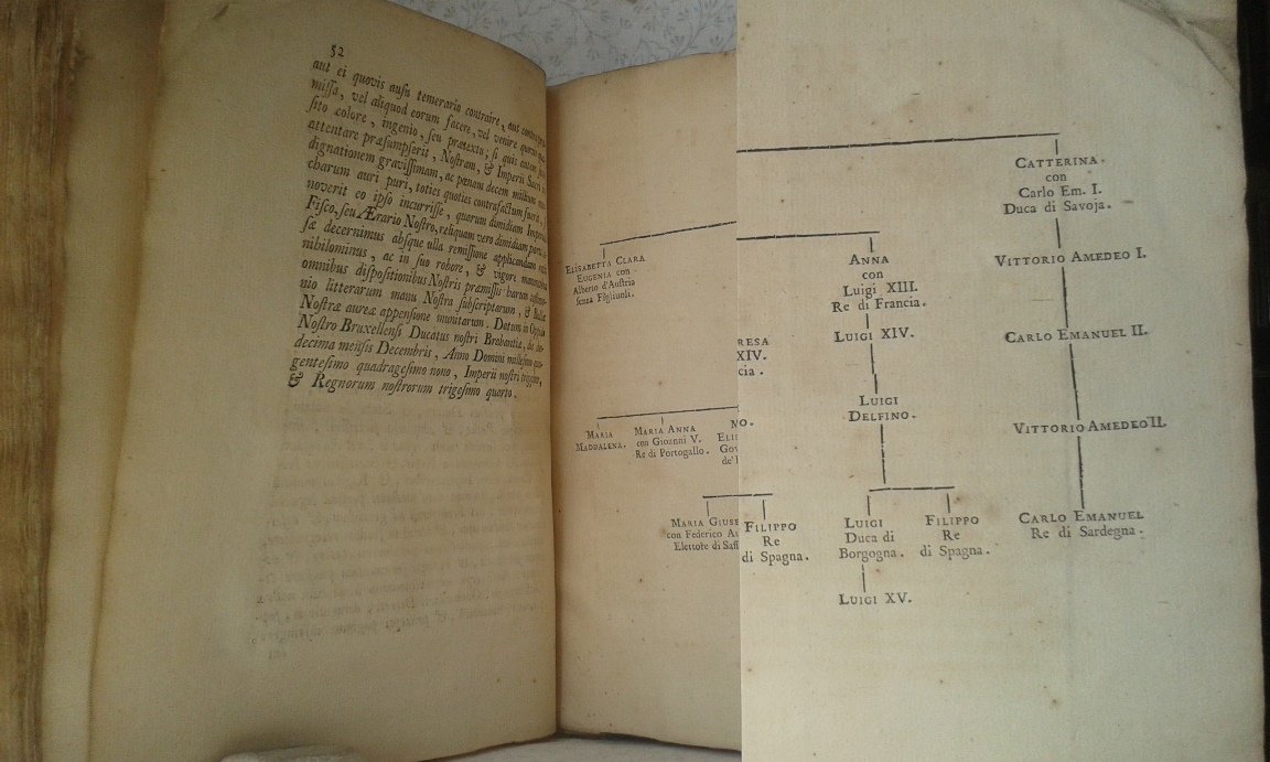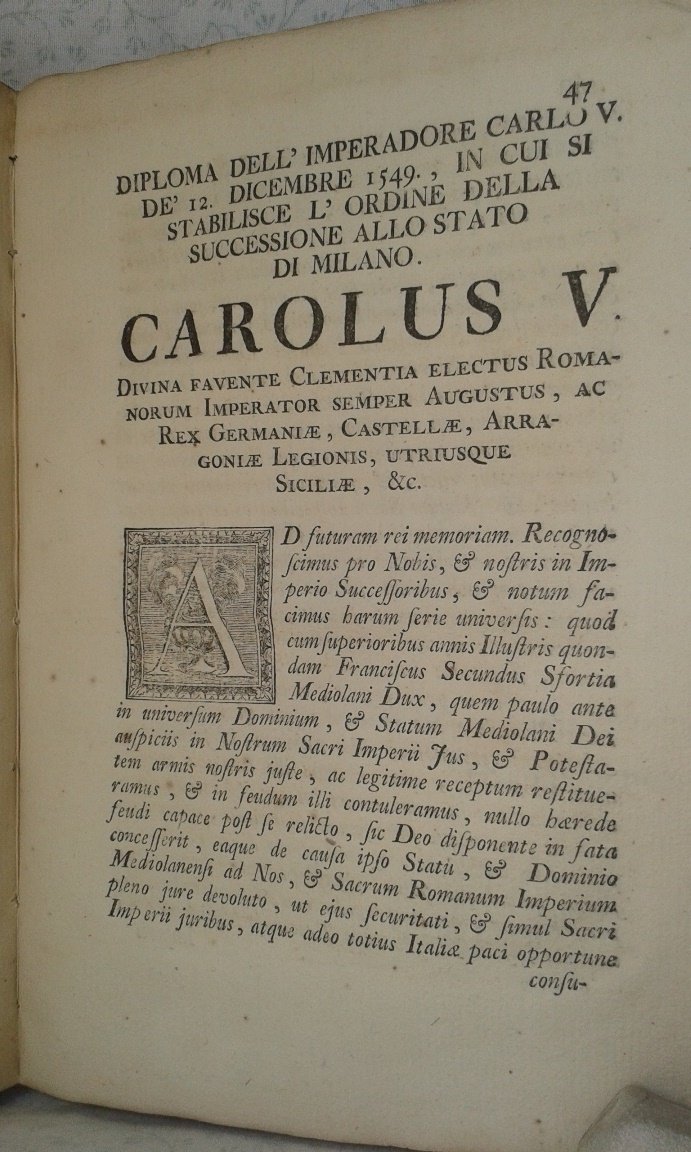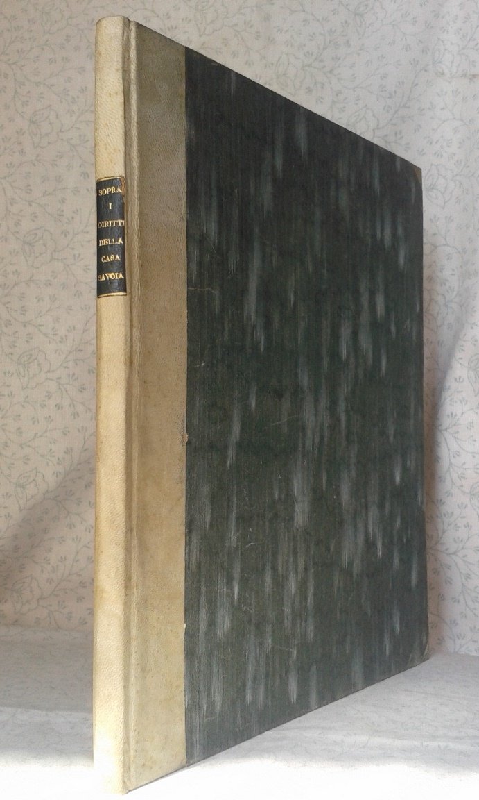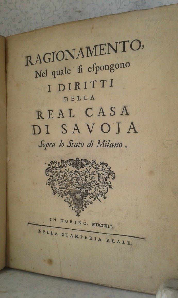 Volume in 4 legato in mezza pergamena con unghie, titolo in oro al tassello al dorso, sguardie, frontespizio con bella marca xilografica, bei capilettera istoriati, 52 pp., 1 tavola genealogica f.t. ripiegata in fondo. Prima ed unica edizione di quest'anonimo studio, che rivendica la successione al Ducato di Milano a favore di Carlo Emanuele III, Re di Sardegna; controversia giuridica apertasi in seguito alla morte di Carlo II di Spagna, e qui sostenuta e giustificata con lausilio del Diploma dell'Imperatore Carlo V, riportato, in latino originale, al termine del volume, seguito dallalbero genealogico con la discendenza di Filippo II compreso il ramo della figlia Caterina sposa di Carlo Emanuele I di Savoia. Ottimo esemplare, stampato a grandi margini su bella carta forte e croccante. Importante e Raro documento.