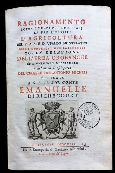 Ragionamento sopra i mezzi più necessarj per far rifiorire l'Agricoltura del P. Abate D. Ubaldo Montelatici della Congregazione Lateranese colla relazione dell'Erba Orobanche detta volgarmente Succiamele e del modo di estirparla del celebre