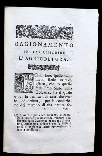 In 8° (20x13 cm); XII, 127, (3) pp. e una bellissima antiporta figurata incisa da Virginia Cordelli su disegno di Filidauro Rossi. Bella legatura coeva in piena pergamena rigida con titolo impresso al dorso. Tagli marmorizzata. Stemma calcogr. del dedicatario, il conte Emanuel de Richecourt, sul front. Antico timbretto settecentesco della celebre "Biblioteca Comitale Borgettiana" al frontespizio. Il domenicano Tommaso Maria Borgetti, eminente personalità del mondo marchigiano, dopo aver ereditato la biblioteca di famiglia integrò la stessa nel corso della sua vita attraverso scambi, vendite ed acquisizioni. Nei primi anni dell'ottocento rese disponibile la sua collezione alla consultazione di studiosi e bibliofili e alla sua morte, nel 1833, lasciò la sua biblioteca a lla città di Macerata che la fece confluire i volumi in quella che sarebbe poi diventata la Biblioteca Comunale Mozzi-Borgetti proprio in memoria delle due donazioni principali che ancora oggi la compongono. All'interno dell'opera qui presentata si trova la celebre "Relazione dell'erba detta da' botanici orobanche e volgarmente succiamele, fiamma e mal d'occhio che da molti anni in quà si è soprammodo propagata quasi per tutta la Toscana. Nella quale si dimostra con brevità qual sia la vera origine di detta erba, perchè danneggi i legumi, e il modo di estirparla. Scritta a benefizio degli agricoltori Toscani". Prima assai rara edizione in prima tiratura (una seconda tiratura uscì nello stesso anno) di questo importante scritto che diede origine all'Accademia dei Georgofili opera del celebre agronomo, letterato, studioso e accademico dei Georgofili, Antonio Motelatici. Fu proprio in risposta a questo scritto e su invito dello stesso Montelatici che un gruppo di studiosi, fra i quali il stesso autore, diede vita a Firenze il 4 giugno 1753 all'accademia dei Georgofili. La finalità iniziale era commentare le proposte di Montelatici di un ampliamento degli orizzonti della ricerca agronomica. Dopo un lungo soggiorno in terra francese, Montelatici al suo ritorno in Italia nel 1747, aveva portato con se un'impostazione illuminista. Con una scelta molto innovativa per i tempi l'obiettivo sociale additato dal dotto religioso fu quello di un organismo perfettamente democratico, come dice Montelatici "una perfetta anarchia". "Nominato abate della badia di S. Bartolomeo, mise a frutto le sue ricerche agrarie scrivendo il Ragionamento sopra i mezzi più necessari per far rifiorire l'agricoltura (Firenze 1752; edizione parziale in Scritti teorici e tecnici di agricoltura., 1989, pp. 31-429), opera nella quale elaborò l'idea di fondare una società a favore dell'"industria agraria ". Montelatici si lega, in effetti, alla nascita dell'Accademia dei Georgofili, avvenuta a Firenze nel 1753, di cui fu fin da subito riconosciuto come "institutore" e nominato "segretario". Si trattava del "primo e nobile esempio in Europa d'una associazione d'ingegni intesi al perfezionamento dell'agricoltura" (Tabarrini, 1856, p. 3). L'agricoltura era considerata da Montelatici "arte nobile, dilettevole e fruttuosa madre e nutrice di tutte le altre, sostegno e mantenimento della Repubblica" (Ragionamento, 1752, p. 2) Gli interessi agrari di Montelatici possono essere collocati in quella fase centrale del Settecento in cui si delinea una nuova visione economica, che sviluppando le idee di Sallustio Bandini spinge i capitali toscani a spostarsi sempre più dal commercio all'agricoltura. In questa ottica i grandi proprietari fondiari erano sollecitati a superare l'atteggiamento assenteista per dedicarsi allo studio dell'agricoltura, occuparsi delle loro terre e migliorare l'attività rurale." Insieme a Genovesi del quale fu amico, Montelatici fu tra i primi a sviluppare in Italia le teorie economiche illuministe. Prima rara edizione, in bella legatura coeva ed in perfette condizioni di conservazione. Bibl.: Einaudi 3992. Non in Goldsmith, Mattioli, Higgs.