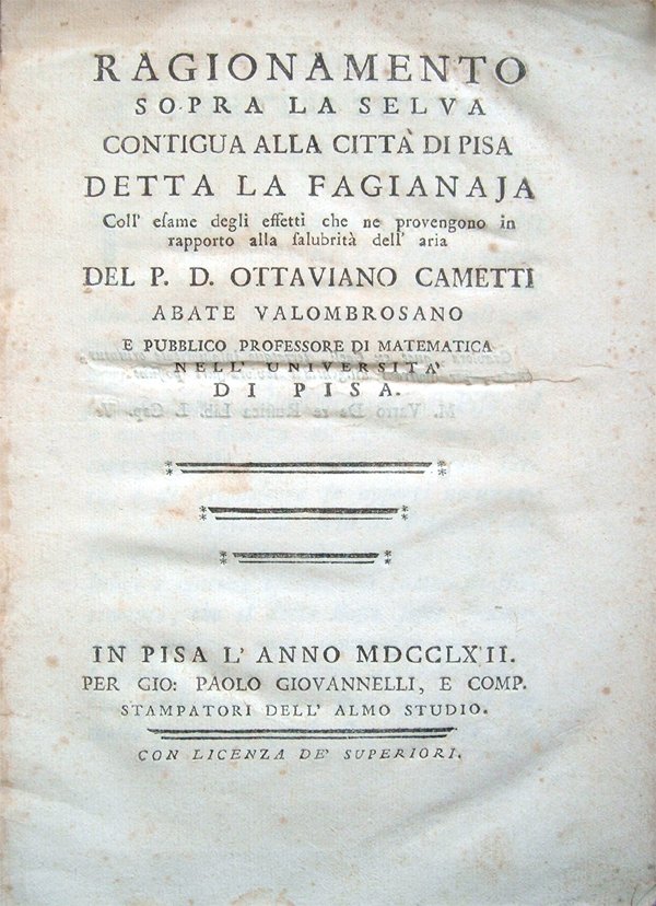 Ragionamento sopra la selva contigua alla città di Pisa detta la Fagianaja. Coll'esame degli effetti che ne provengono in rapporto alla salubrità dell'aria del P. D. Ottaviano Cametti, abate valombrosano e pubblico professore di Matematica