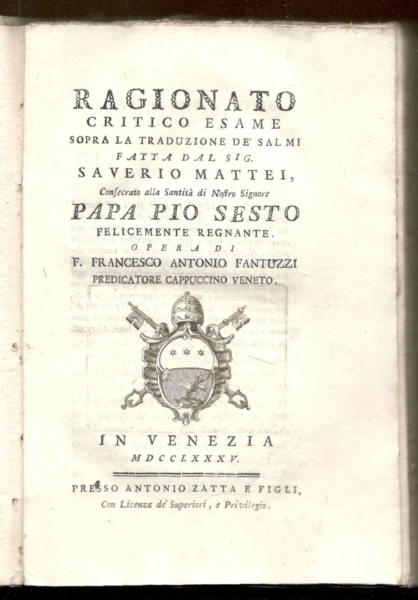 Ragionato critico esame sopra la traduzione dei Salmi fatta dal sig. Saverio Mattei onsecrato alla santità di nostro signore papa Pio Sesto felicemente regnante. Tomo I. Dal Salmo I al Salmo XVII