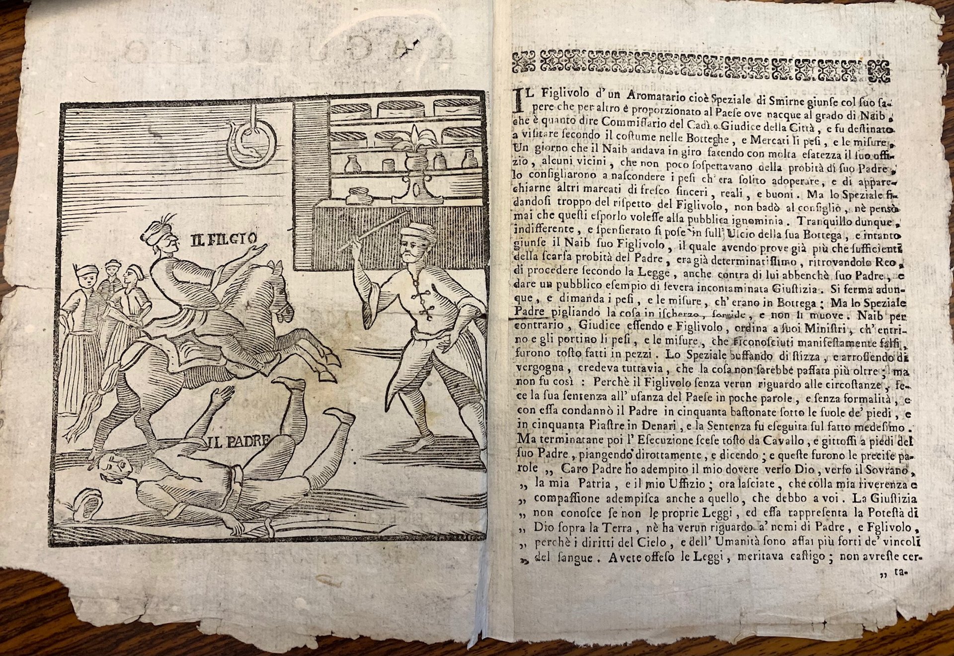 >in-4 piccolo (mm200x155), pp. 4 n.n., fregio xilografico al frontespizio, grande tavola xilografica a piena pagina (a p. 2). Rarissimo foglio volante figurato. Dettagliato racconto di un fatto di cronaca svoltosi a Smirne, ove il ''Figliuolo d'un Aromatario cioè Speziale'', Commissario del Cadì e Giudice della Città, fece punire pubblicamente il proprio padre per frode, condannandolo a cinquanta bastonate sotto le ''suole de' piedi'', e al pagamento di ''cinquanta Piastre in Denari''. Nella xilografia a piena pagina e raffigura la scena descritta nel testo. Un solo esemplare nelle biblioteche italiane.