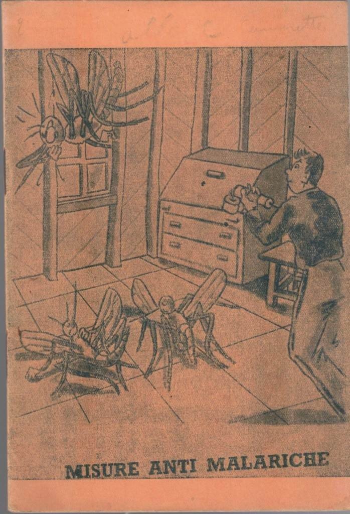 B. L. Raina, Misure antimalariche. Perché? Contro chi? Cosa potete fare voi?, Anti-malaria Committee Yol., s.l., s.d. (ma 1942 ca.), pp. 22, 2 c. di tavv. f.t. ill. col., cm 18, rilegatura a punto metallico. Prefazione di G. de la P. Beresford. Traduzione di De Marchi. Illustrazioni di Calabrò. A margine delle tavole, didascalie in lingua inglese cancellate e sostituite da traduzioni a stampa in lingua italiana. Minime tracce d’uso alla copertina, per il resto ottimo. Estremamente rara edizione italiana di opuscolo con indicazioni anti-malariche destinato ad uso prevalente dei militari.