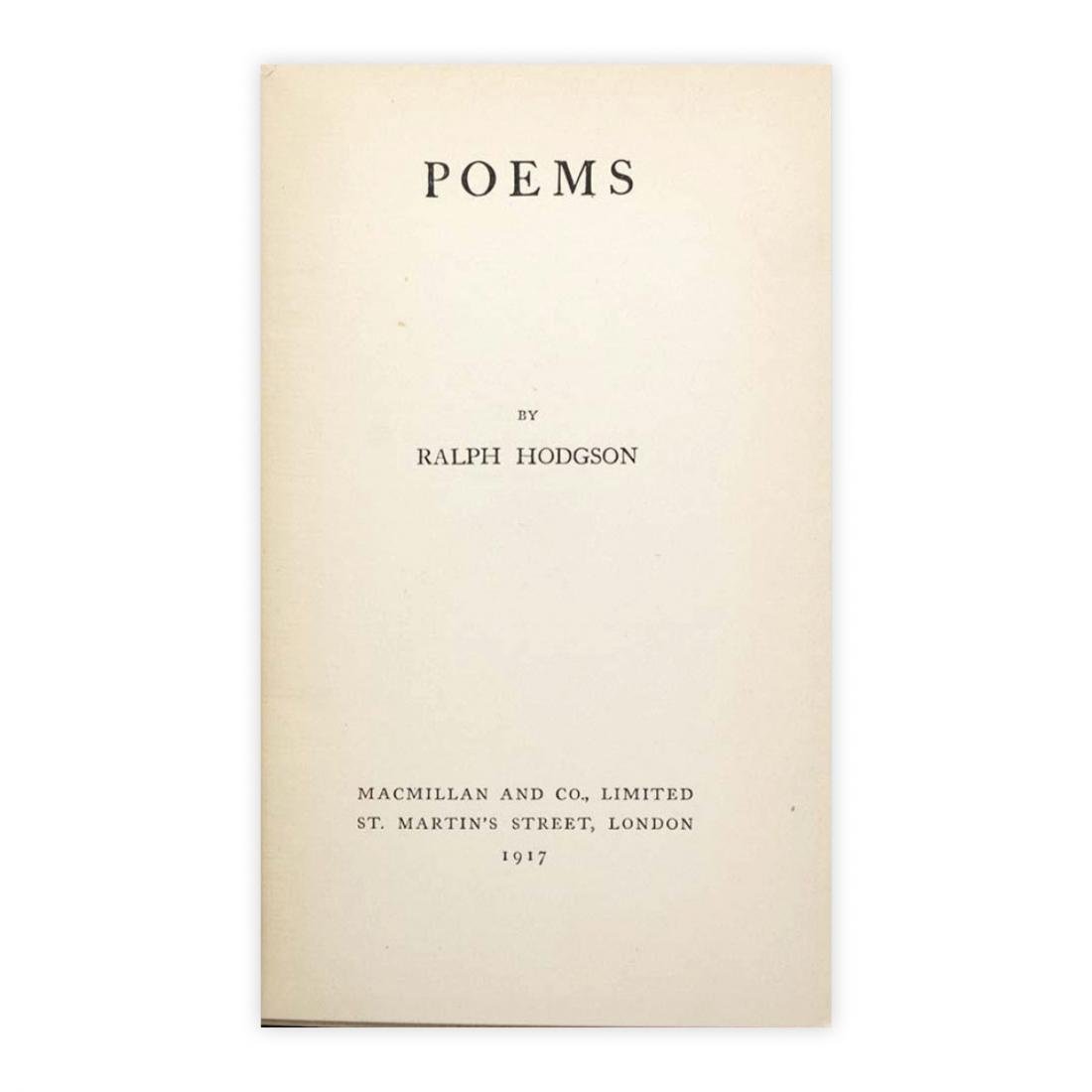 Autore: Ralph Hodgson Titolo: Poems Edizione: Macmillan and Co., Limited St. Martin's Street, London 1917 Dimensioni: 11,5 x 18 cm c.a. Lingua: Inglese Copertina: Cartonato Condizioni: Ottime come da foto