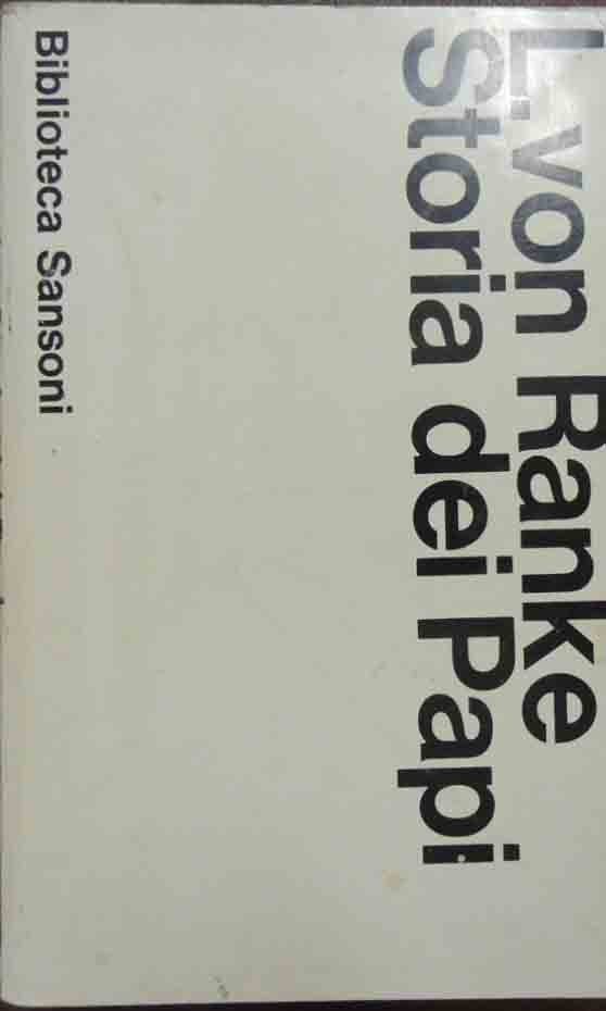 Leopold von Ranke, Storia dei Papi, Sansoni, Firenze 1965, pp. 1050, cm 20, br. ed. Collana Biblioteca Sansoni. Titolo originale: Die romischen Papste in den lette 4 Jahrhunderten. Traduzione di Claudio Cesa. Presentazione di Delio Cantimori. Tracce d’uso, lieve ingiallitura della carta, minime fioriture, ma comunque buona copia.