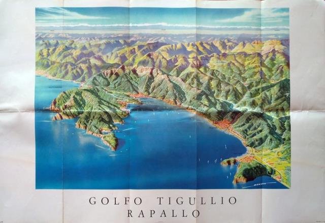 Sigla EfFe, Genova, 1960 circa. Depliant pieghevole in colore, cm 42 x 61,5 (aperto), illustrazioni fotografiche e testi; all'interno la cartina a volo d'uccello del Golfo di Tigullio con segnalati tutti i monti e le località dell'interno e firmata Berann basso a destra, testi in italiano, francese, inglese e tedesco. Buono stato.
