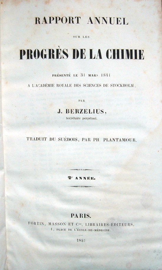 Rapport annuel sur les progrès de la chimie présenté le 31 mars 1841 à l'Académie Royale des Sciences de Stockholm par J. Berzelius Secrétaire perpétuel. Traduit du suédois, sous les yeux de l'auteur, par M. Plantamour. 2.e annèe