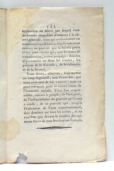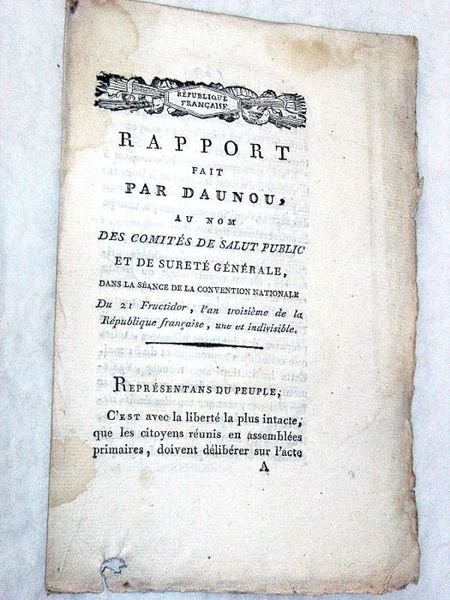 7 pages. (21x14 Cm). Broché. Non rogné et non coupé. Petite déchirure dans la marge inférieure et petits trous au dernier feuillet. Mouillures. Rare impression d'Agen de ce rapport réalisé pour empêcher les citoyens de se réunir en un comité central composé de commissaires nommés par plusieurs assemblées primaires.