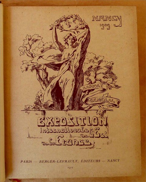 Un très fort volume de format in 4° sur vélin ivoire de CXL; 933 pp.; illustré de 26 planches hors-texte en noir ou en couleurs avec serpentes légendées et de nombreux tableaux, reproductions photographiques, schémas, graphiques dépliants. dans le texte ou hors texte. Une eau-forte un peu brunie en fin de volume représentant le diplôme de l'exposition. Cartes et plans; et un plan dépliant colorié en fin de volume. Reliure de l'éditeur en demi chagrin tabac; dos à caissons ornés et dorés; titre doré; tête rouge; couverture conservée de Victor Prouvé et mise en page typique de "L'Art Nouveau". Reliure en parfait état avec quelques discrètes traces brunes; intérieur comme neuf. Présentation de toutes les grandes entreprises lorraines ou alsaciennes (alors occupées) de l'époque "Art Nouveau"; Baccarat, Ecole de nancy, Métallurgie, Brasseries, Laiteries, Constructions et Ameublement; Textiles, Chimie, Chemins de Fer, Aéronautique, aérostation, Exposition Coloniale, Majorelle, Daum, Saint-Louis. ainsi que des artistes en vue. Voir les photos. Poids important mais port compris pour la France.