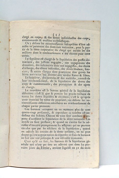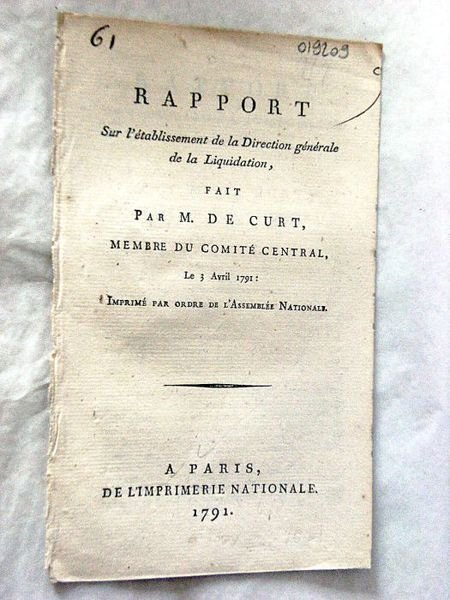 6 pages. (19x12 Cm). Broché. Petites rousseurs. Publié en 1791 à Paris, cet ouvrage de Curt de présente un rapport détaillé sur la mise en place de la Direction générale de la Liquidation, une initiative cruciale dans le contexte post-révolutionnaire français. À cette époque, la France traversait une période de profonds bouleversements politiques et économiques, cherchant des solutions pour gérer sa dette nationale considérable. L'auteur, impliqué dans les mécanismes administratifs de la nouvelle République, offre une perspective interne sur l'organisation des bureaux dédiés à cette tâche.