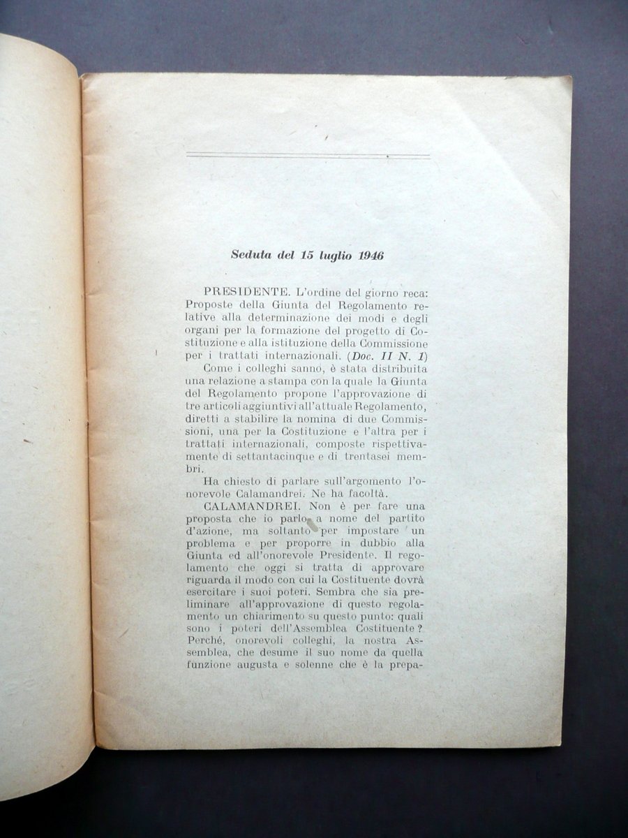 Opuscolo, Partito d'Azione - Rapporti fra Costituente e Governo Discussione sulla proposta dell'onorevole Calamandrei nelle sedute del 15 luglio e del 12 settembre 1946 Roma 1946; cm 21x15, pp. 36; brossura ed. Condizioni di conservazione Esemplare ben conservato con tracce d'uso; brossure con alcune minime leggerissime tracce di sporco. Interni buoni. SC03.D12346 N