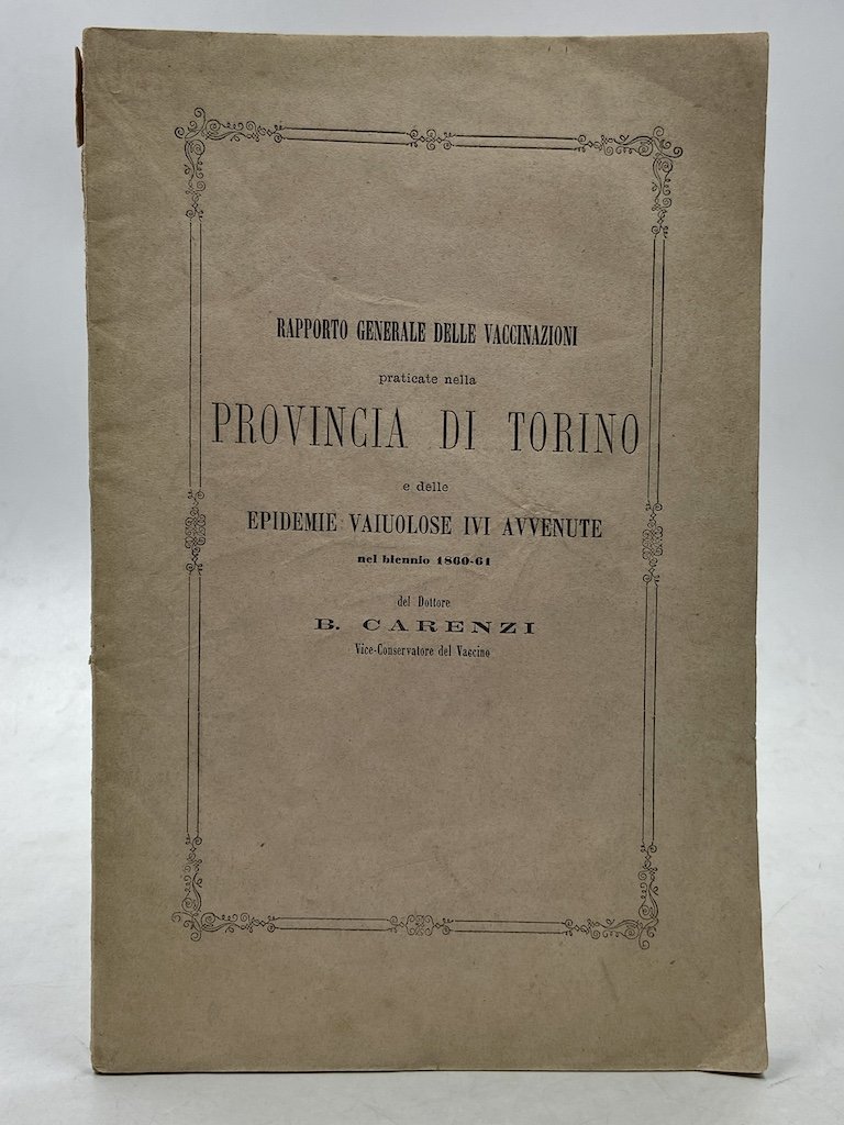 RAPPORTO GENERALE DELLE VACCINAZIONI PRATICATE NELLA PROVINCIA DI TORINO E DELLE EPIDEMIE VAIUOLOSE IVI AVVENUTE NEL BIENNIO 1860-1861 DEL DOTTORE B. CARENZI VICE-CONSERVATORE DEL VACCINO.