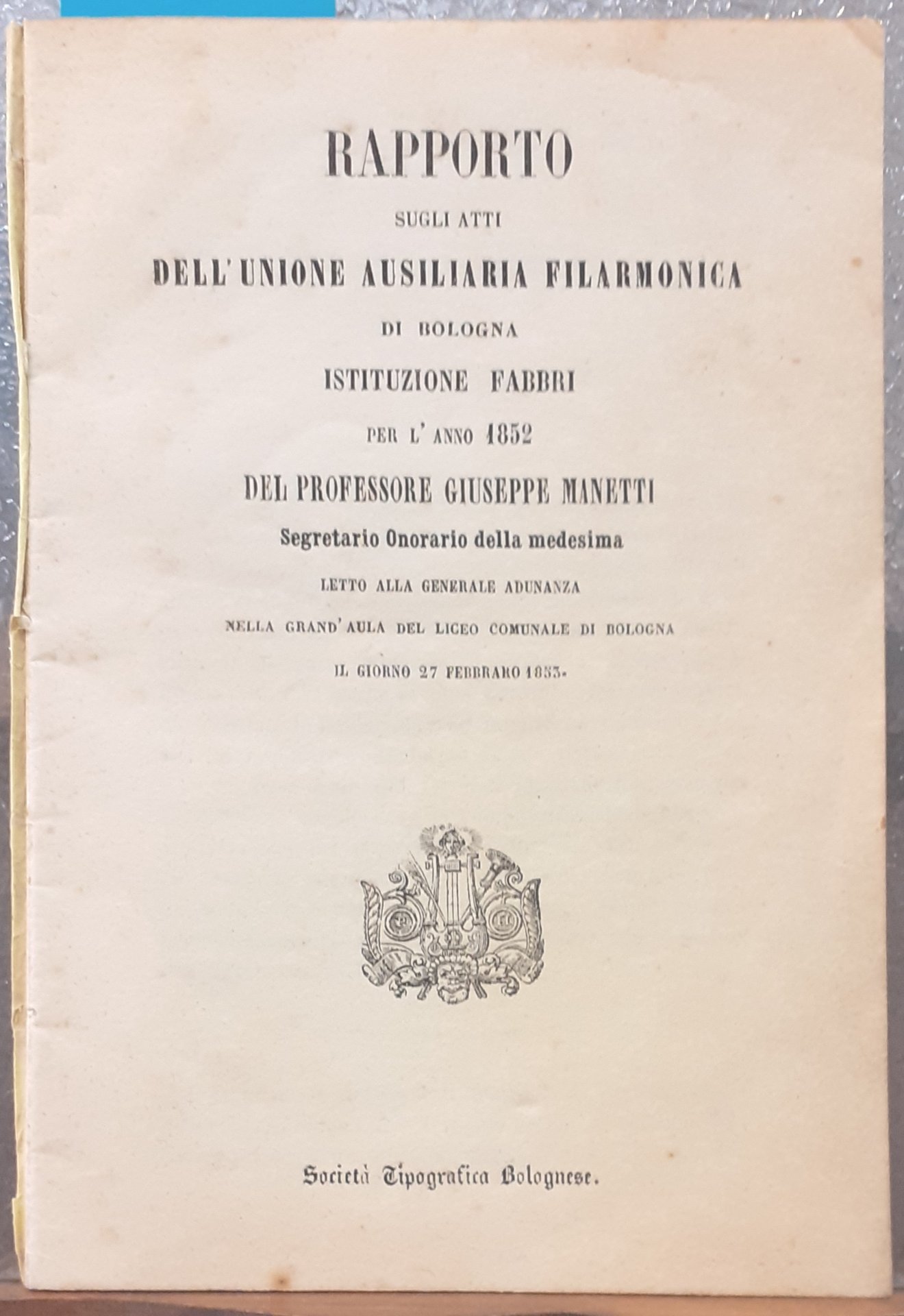 RAPPORTO SUGLI ATTI DELL'UNIONE AUSILIARIA FILARMONICA DI BOLOGNA ISTRUZIONE FABBRI PER L'ANNO 1852.