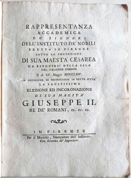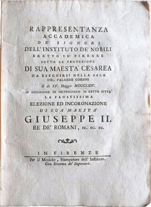 Rappresentanza accademica de' signori dell'istituto de' Nobili eretto in Firenze sotto la protezione di sua Maestà Cesarea da eseguirsi nella sala del Palazzo Corsini il dì XV Maggio MDCCLXIV in occasione di festeggiarsi in detta città la faustissima elezione ed incoronazione di sua Maestà Giuseppe II.