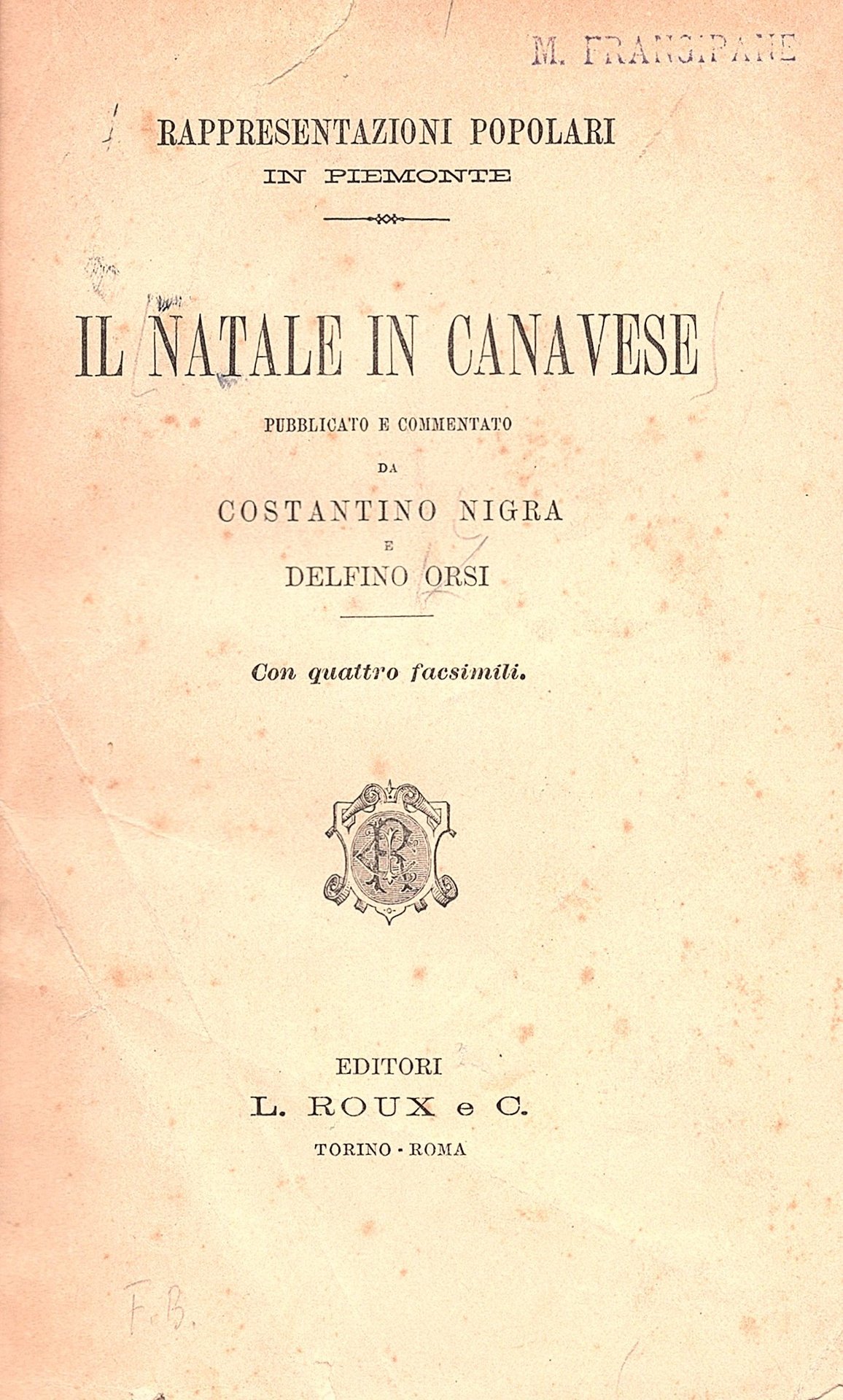In-16° (19x13 cm)., mezza tela coeva verde con titolo dorato su tassello granata al dorso, piatti rivestiti carta marmorizzata, conservati i piatti delle brossure editoriali. Pp. 160, (2), 4 tavole di fac-simili b/n fuori testo; 188, 2; 208, 2 tavole a colori fuori testo riproducenti xilografie popolari Il giudizio universale (di fronte a p. 7) e La Morte (tra le pp 58 e 59) Ex libris coevo al primo volume. Più che buoni esemplari (il secondo e il terzo a fogli chiusi). Raccolta completa dei tre volumi delle 'Rappresentazioni popolari in Piemonte' in edizione originale, rara, di fondamentale strumento di studio sulla letteratura religiosa popolare in Piemonte. Costantino Niga (1828-1907) fu filolologo e poeta e contribuì insieme a D. Orsi alla nascita dello studio delle letteratrua e delle tradizioni popolari piemontesi. Delfino Orsi (Dogliani,1868-Torino, 1929), fratello dello scienziato Alessandro e dello storico Pietro, fu direttore della 'Gazzetta del Popolo', Senatore del Regno dal 1924, direttore della Società Filarmonica di Mondovì, studioso di tradizioni popolari e docente di materie letterarie all'Università di Torino, nonché presidente dell'Opera Pia San Paolo e dell'Istituto di Credito Agrario di Torino. Cfr. Toschi, Le origini del Teatro italiano, p. 713.
