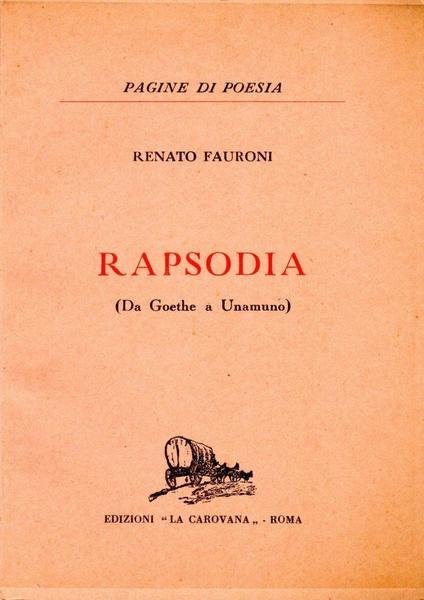 Rapsodia (Da Goethe a Unamunno), prima edizione gennaio 1957, pp. 55, formato 12,5 x 17,5. <BR>Copertina morbida di colore ocra con titoli in nero e rosso al piatto anteriore e in nero sul dorso. Presente sovraccoperta trasparente di protezione. <BR>Ottime condizioni.