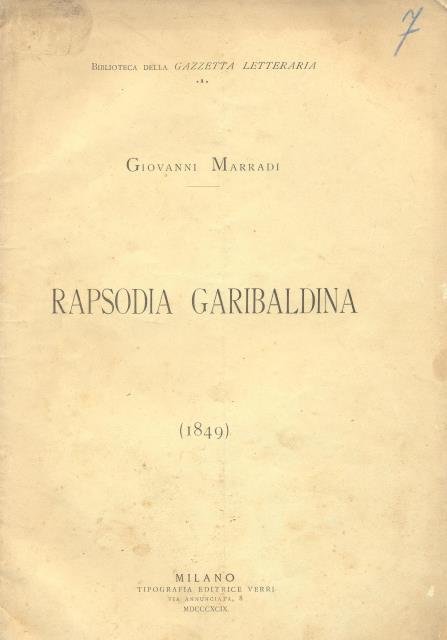 Tipografia Editrice Verri, Milano, 1899. Biblioteca della Gazzetta Letteraria. Dedica a Domenico Gnoli. In 4to, pp. 19, bross. edit. in carta. Prima edizione del noto poemetto in terzine del Marradi, celebrativo della figura di Garibaldi. Leggera patina di copertina con alcune macchiette, una piega al centro, discreta conservazione.