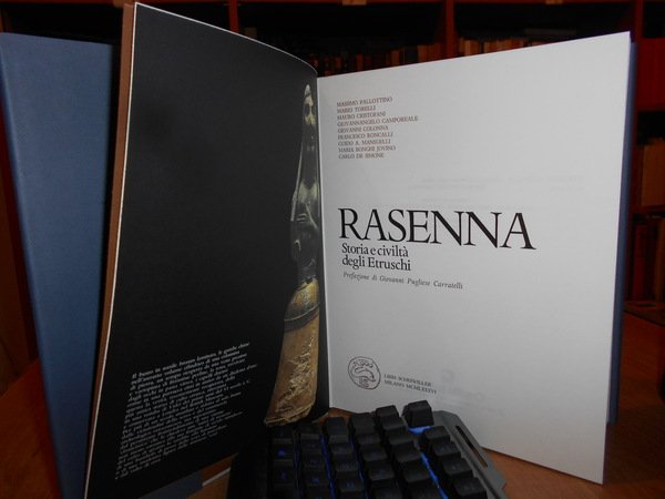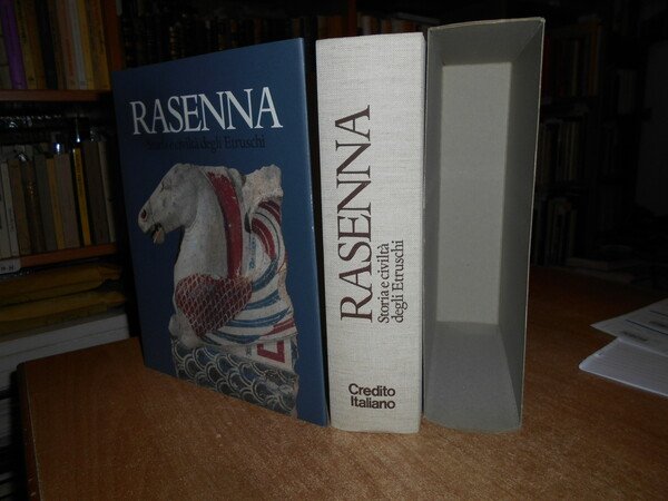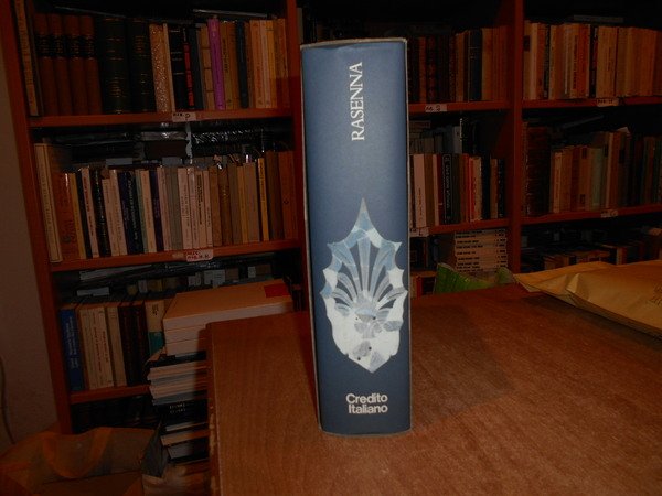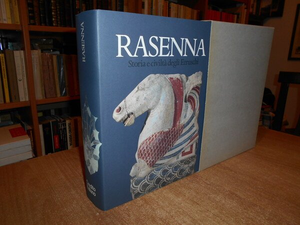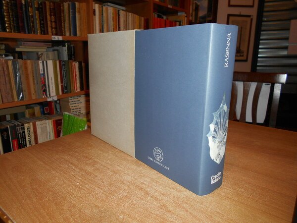 AA. VV. Milano, Libri SCHEIWILLER per Credito Italiano, 1986. RASENNA. Storia e Civiltà degli Etruschi. Prefazione di Giovanni Pugliese Carratelli. In-4° piccolo, tela edit. con titolo sul piano e al dorso, sovracopertina ill. a col. xiv, 729, (3) pp. con innumerevoli illustrazioni la maggior parte a colori anche a piena pagina e in tavole ripiegate. In stato di nuovo con astuccio in cartoncino muto. Uff. stanz. TV. mob. fronte nostro in alto.
