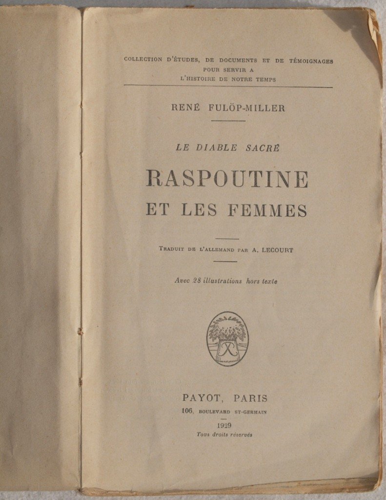 In 8. Dim. 23x14 cm. Pp. 392+(4). Edizione del 1929 di questa interessante opera sul monaco russo Grigori Rasputin di Renè Fulop Miller (1869-1916). Il volume è uno studio su Rasputin e le donne: monaco Illiodoro; Alexandra Feodorovna; Elisabeth Feodorovna; Anna Viroubova; duchessa Elisabeth; Militze ed Anastasia; il colonnello Loman; Anna Viroubova; le orgie di Rasputin ecc. All'interno sono presenti 28 planches fotografiche. In discrete condizioni. Copertina mancante. Legatura in mediocri condizioni con rotture. All'interno le pagine si presentano in buone condizioni con rare fioriture. Edition of 1929 of this interesting work about the russian monk Grigori Rasputin di Renè Fulop Miller (1869-1916). The volume is a study about Rasputin and the women: the monk Illiodoro; Alexandra Feodorovna; Elisabeth Feodorovna; Anna Viroubova; dukess Elisabeth; Militze and Anastasia; the colonnel Loman; Anna Viroubova ecc. Insdie there are 28 photographic planches. In fair conditions. Cover is missing. Binding in poor conditions with cracks. Inside pages are in good conditions with occasional foxings.