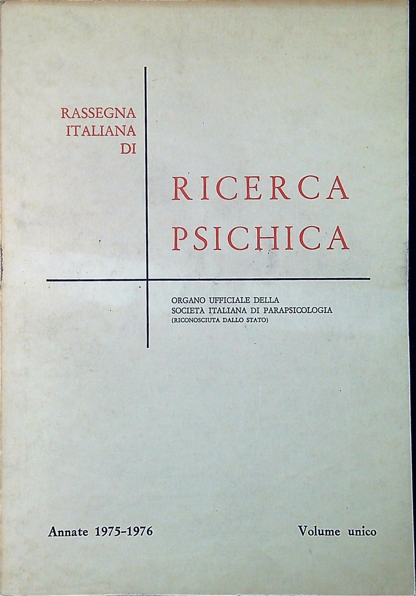 Società italiana di parapsicologia Rassegna italiana di ricerca psichica : anno 1975-1976 Fascicoli 1-2-3. Roma, Società italiana di parapsicologia, 1976, 134 p. ; 24 cm (70581)