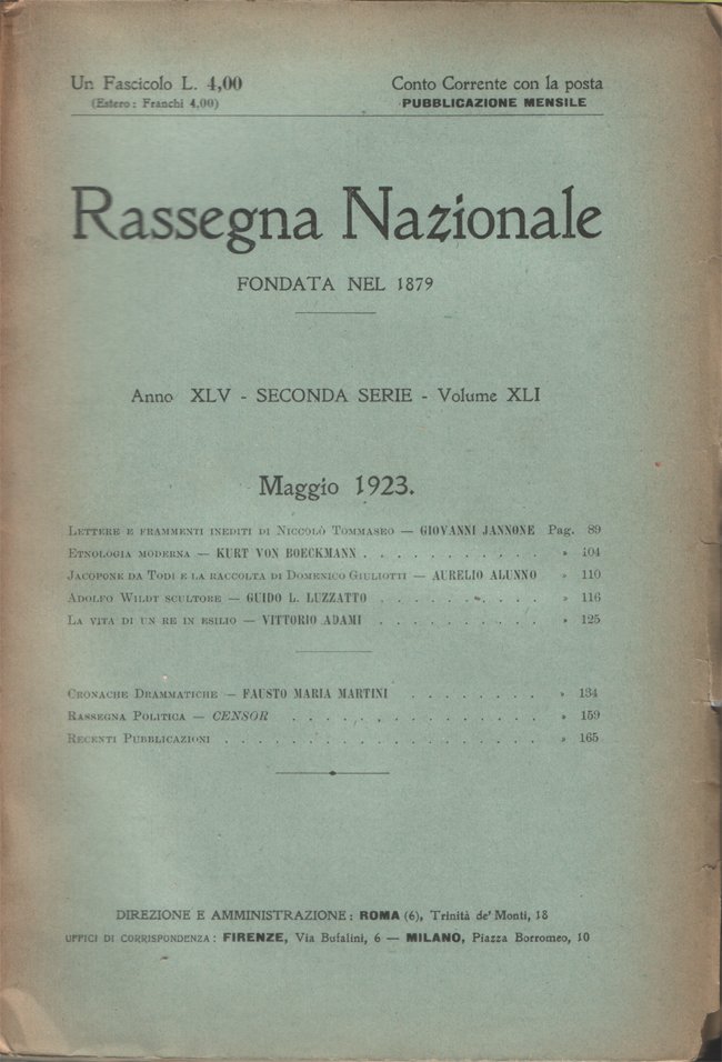 In-8°, pp. 4, (4), da 89 a 168, copertina editoriale con normali tracce d'uso e del tempo (vedi foto): in particolare, qualche strappetto ai bordi e dorso e bordi bruniti (cartoncino un po' fragile). Restauro al dorso. Nel margine esterno del foglio che ospita le pp. 133-134 e nel margine superiore del fogli con le pp.151-158, lontano dal testo, piccolo strappo risarcito con carta giapponese. Normale patina del tempo alle pagine, con arrossature, più pronunciate ai margini, dovute al tipo di carta. Per il resto, in buono stato. Parzialmente intonso. Sommario: Giovanni Jannone, Lettere e frammenti inediti di Niccolò Tommaseo; Kurt von Boeckmann, Etnologia moderna; Aurelio Alunno, Jacopone da Todi e la raccolta di Domenico Giuliotti; Guido L. Luzzatto, Adolfo Wildt scultore; Vittorio Adami, La vita di un re in esilio (Gustavo IV di Svezia). Fausto Maria Martini, Cronache Drammatiche: "Signora padrona" di G. Benaventa (Teatro Argentina, Compagnia Niccodemi, 31 marzo 1923); "Il Conte Gioia" di D. Tumiati, (Teatro Quirino, Compagnia Betrone, 9 aprile 1923); "Terra inumana" di De Curel, (Teatro Valle, Compagnia Ruggeri, 4 aprile 1923); "L'attore" di Sacha Guitry (Teatro Valle, Compagnia Ruggeri, 10 aprile 1923); "Lontananze", di Salvator Gotta (Teatro degli Italiani, Compagnia stabile diretta da Mario Fumagalli e da Lucio D'Ambra, 13 aprile 1923); "La sentinella morta", di L. D'Ambra (Teatro Nazionale, Compagnia Monaldi, 18 aprile 1923); "La leggenda di Liliom" di F. Molnar (Teatro Quirino, Compagnia Betrone, 19 aprile 1923); "Palma e il suo metodo" di E. De Fonseca (Teatro Valle, Compagnia Ruggeri, 24 aprile 1923); "La Baracca" di E. Possenti (Teatro Argentina, Compagnia Niccodemi, 27 aprile 1923); R. P., "L'altra Nanetta" di Fausto Maria Martini. Censor, Rassegna politica (pp. 159-164): Il Congresso del Partito Popolare; Le dimissioni del Ministro del Lavoro e dei Sottosegretari del partito; Soppressione del dicastero; Il partito liberale e la collaborazione; Le scissioni nel campo fascista; I sindacati; La riforma della scuola media e l'esame di Stato; La riforma dei codici; Nuovo combattimento in Libia; La conferenza di Losanna; La questione della Ruhr; La nota tedesca per le riparazioni; La rapida risposta della Francia e del Belgio; L'attitudine dell'Inghilterra; Il viaggio dei sovrani inglesi a Roma; Il prestigio e il rifiorire delle manifestazioni cattoliche. Recenti pubblicazioni: Alexandre Lety-Courbière, Accords et préludes, Paris, Editions "Athèna"; G. Tenti, Il lumino in cima alla montagna, Foligno, Ed. Campitelli.