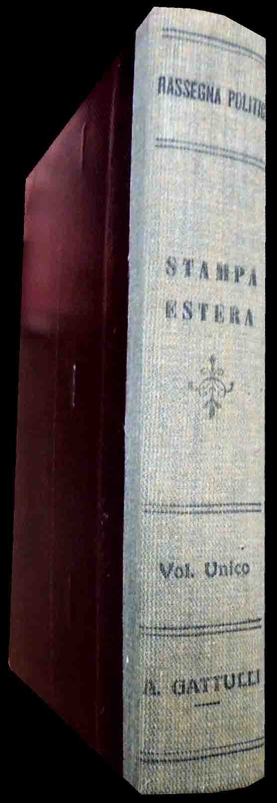 Ministero degli Affari Esteri – Ufficio Stampa, Rassegna settimanale della stampa estera, Stabilimento Poligrafico dello Stato, Roma, anni II-III, 1927-1928, 9 fascicoli non consecutivi, paginazione varia per un totale di circa pp. 635 con testo disposto su due colonne, cm 26, bella e solida legatura coeva in mezza tela con titoli, filetti e fregio al dorso e angoli in tela. Legato con: Ministero degli Affari Esteri – Ufficio Stampa, Rassegna quindicinale delle riviste estere, Stabilimento Poligrafico dello Stato, Roma, anno II, fasc. 1, 1 gennaio 1928, pp. 1-71 con testo disposto su due colonne. Legato con: Tempo di scuola. Rivista mensile dell’ordine medio, superiore ed artistico, diretta da Nazareno Padellaro, Vallecchi Editore, Firenze, anno II, n. 3, 1941, pp. 163-240, ill. b.n. Legato con: Chimera. Rassegna di poesia contemporanea, direttore Gianfranco Doria, Edizioni Alfa, Roma-Palermo, agosto 1934, pp. 62. Volume miscellaneo. Il volume contiene i seguenti 9 fascicoli della rivista Rassegna settimanale stampa estera, edita a cura del Ministero degli Affari Esteri: a. II, fasc. 40, 4 ottobre 1927 (V), pp. 2707-2768 – a. II, fasc. 42, 18 ottobre 1927 (V), pp. 2837-2904 – a. II, fasc. 45, 8 novembre 1927 (VI), pp. 3037-3104 – a. II, fasc. 48, 29 novembre 1927 (VI), pp. 3263-3350 – a. II, fasc. 49, 6 dicembre 1927 (VI), pp. 3351-3429 – a. II, fasc. 50, 13 dicembre 1927 (VI), pp. 3431-3492 – a. III, fasc. 3, 10 gennaio 1928 (VI), pp. 137-200 – a. III, fasc. 4, 17 gennaio 1928 (VI), pp. 201-274 – a. III, fasc. 5, 24 gennaio 1928 (VI), pp. 275-343. Il volume contiene inoltre un fascicolo della rivista Rassegna quindicinale delle riviste estere, edita a cura del Ministero degli Affari Esteri, un fascicolo della rivista Tempo di scuola e un numero di Chimera. Rassegna di poesia contemporanea. Di quest’ultimo è conservata la brossura originale, con frontespizio ill. da Ninetta Ventimiglia. Indice di Chimera. Rassegna di poesia contemporanea, agosto 1934: Giovanni Pascoli, Romagna – Vittorio Locchi, Il torrente – Id., Il ritorno – leo Negrelli, Gli asfodeli di Gammart – Giuseppe Gerini, Necessità di pane – Id., Olmo dell’orto – Idilio Dell’Era, I sonetti della mamma – Federico De Maria, Canzonetta senza importanza – Rina Pellegri, Alba - id., Ora suprema – Gavino Leo, Maria – Id., Lucciola – Filippo De Filippi, L’ape – Id., Gli zefiri – Id., Fiammate – Geppo Tedeschi, Madri d’Italia – Giorgio Menzio, Ritorno – Giovanni Cardella, Un po’ di sosta – Id., Il nido – Massimo Rodinò, Ozio – Id., L’arca odorata – Armando Zamboni, Le pecorelle – Id., L’isola del sole – Elsa Goss, L’ideale della nonna – Francesco Marrone, Gargano – Id., Sogno di bimbo – Emilio Interlandi, Il pensiero di mamma – Id., Santo Francesco – Antonio Gabrielli, Pasqua – Id., Nenia d’agosto – Carlo Galasso, Luce – Id., Ricordi? – Luisa Trumpy, A Maria Gabriella – Id., Sotto le stelle – Giovanni Acutis, La vita – Id., Vecchio pozzo – Luigi Monsagrati, Io seguo nell’orto… - Id., Elegia – Libero Torraca, Due stelle – Id., Occhi – Id., Pace! – Clemente Scaccianoce, Arcano – Id., Visione notturna – Guglielmo Surrentino, Lontananze - Id., Il tabernacolo – Nicolò Maria Bruno, Rosa che appassisce – Id., Sprazzo d’autunno – Gaetano Buccheri, Da Omero: Enea e Diomede – Id., Tristezza – Umberto La Fortuna, Due bimbe e due bambole – Id., Germoglia il grano – Elisa di S. Secondo Cibrario, Il Nome – Id., I fiori che non sanno morire – Michele Cassano, Nenia – Id., Commiato – Agostino Pernice, Incantesimo – Id., La fonte – Alfredo Confidati, Credere – Id., La mia bimba – Alfredo Cantone, Vent’anni – Tanina De Mattia, La lampada – Giuseppe Giliberti, Nel sereno firmamento – Id., A Pompei, necropoli dle Vesuvio – Stefano Capone – A San Giovanni Bosco – Gaetano Gargiuto, Vele – Id., Isola d’Ischia – Daniele Properzi, Il primo bacio – Id., A due stornellatrici – Oronzo Andretta, In campagna – Id., Alito di primavera. Indice di Tempo di scuola, a. II, n. 3, 1941: L. Stefanini, La didattica degli esemplari – L. Volpicelli, La famiglia e la scuola media – P. Bargellini, All’amico insegnante – A. B. C., la consulta della G.i.l. – P. B., Scuola di Alberto Caligiani – N. Padellaro, L’orientamento – P. Bargellini, Corrispondenza urgente – G. Belardinelli, L’esame di ammissione alla scuola media – Senefente, Socrate e il pappagallo – Gorgonio, Alloro o ghiande? – R. Giannarelli, La guerra e la scuola – M. Spicuzza, Gli ufficiali delle assenze (I) – G. Aliprandi, Echi di un convegno – P. Panichi, Il consiglio di classe nella scuola media – P. Santi, Lettera sulla scuola, i letterati, i professori ed altre cose – E. Jacovelli, Ci scrivono… Il disegno nella scuola secondaria – Sussurro, Ultime di letteratura – Recensioni. Minime fioriture ad alcuni dei fascicoli, per il resto ottimo.