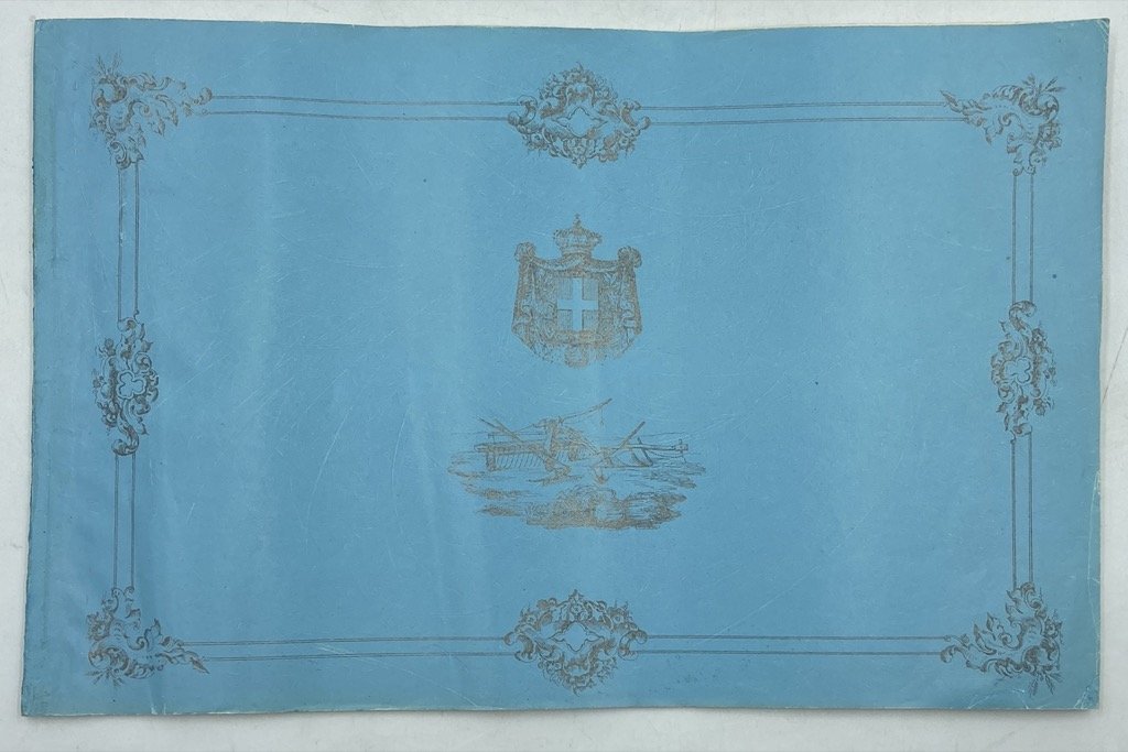 Brossura editoriale in carta azzurra a stampa con piccola illustrazione sul piatto anteriore e iniziali coronate sul posteriore (piccoli restauri), formato album cm 17x27, pp (2) 6 (2) + 8 carte stampate al solo recto (7 tavole e una di testo) e 1 carta bianca. Il Conte Carlo Morelli descrive nei dettagli il «rastello spigolatore» di sua invenzione, con tavole.