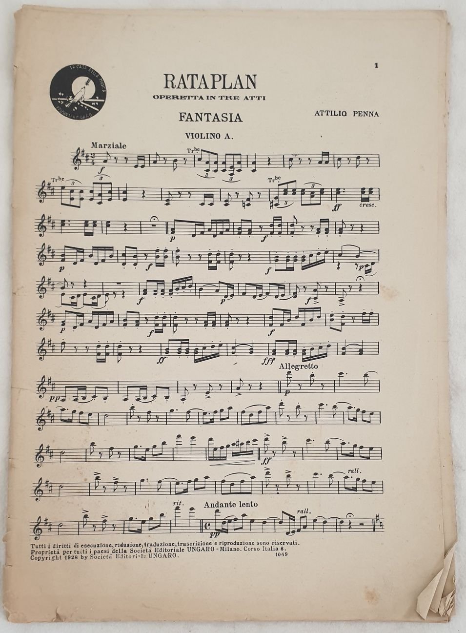 Partitura per orchestra del 1928 della melodia "Rataplan" di Attilio Penna. Copertina assente. GENERE: STRUMENTI: violini, contrabbasso, tromba, trombone, clarinetto, flauto, batteria ANNO: 1928 DIMENSIONI: In 4. cm 33x24 PAGINE: pp. 32 CONDIZIONI: Discrete condizioni. Fioriture e strappi marginali Beautiful score of one song of 1928, a score for orchestra of the melody "Rataplan" by Attilio Penna. Cover lacks MUSIC: STRUMENTI: violins, contrabass, trumpet, trombone, clarion, flute, drums<BR>YEAR: 1928 SIZE: In 4. cm 33x24 PAGES: pp. 32 CONDITIONS: Fair conditions. Foxing and tears in the extremities<BR>